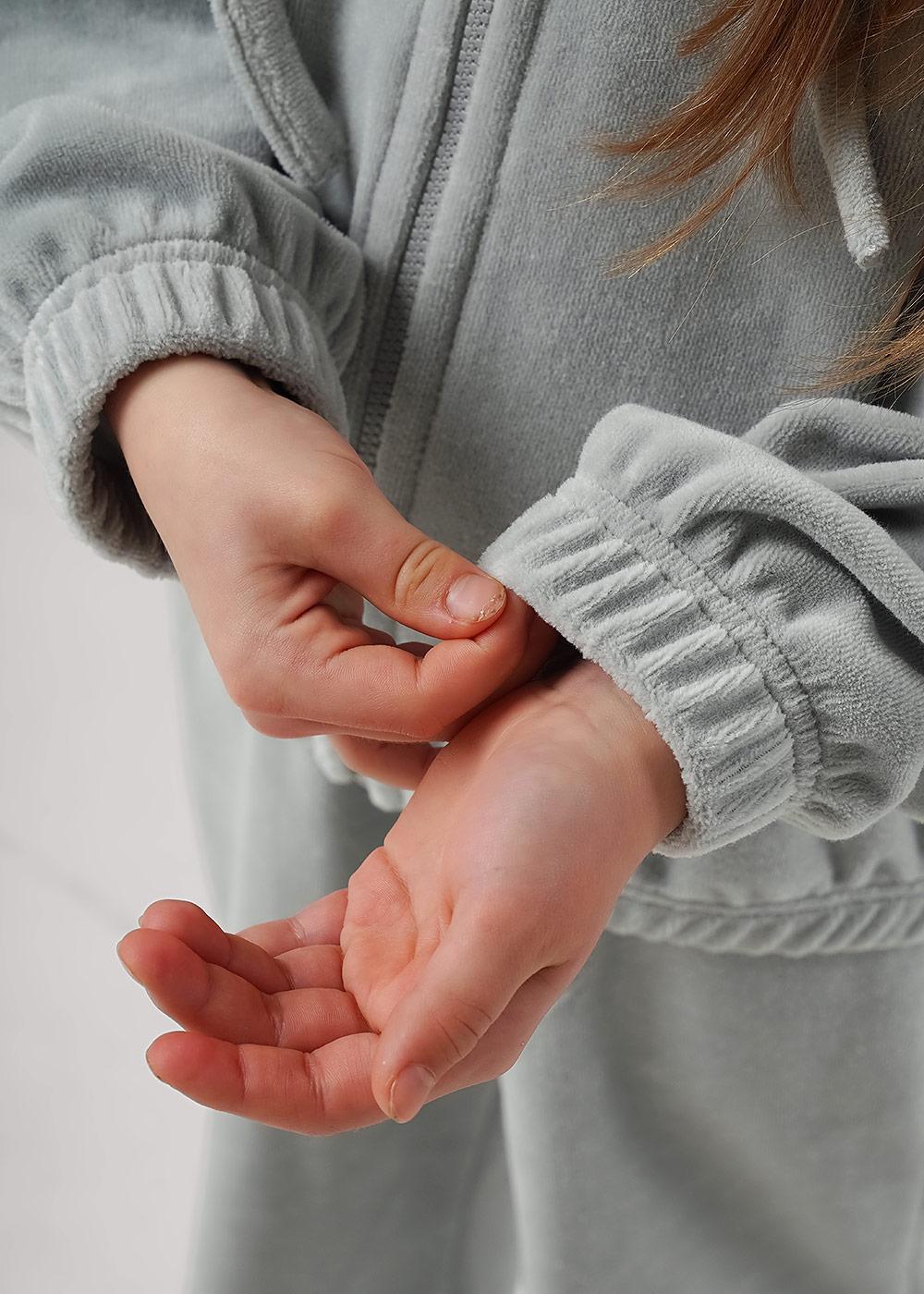 Уютная толстовка из мягкого велюра для девочки. Модель с застёжкой-молнией, свободным силуэтом и удобным капюшоном. Длинные рукава и карманы-кенгуру. Приятный на ощупь материал создаёт комфорт и сохраняет тепло.