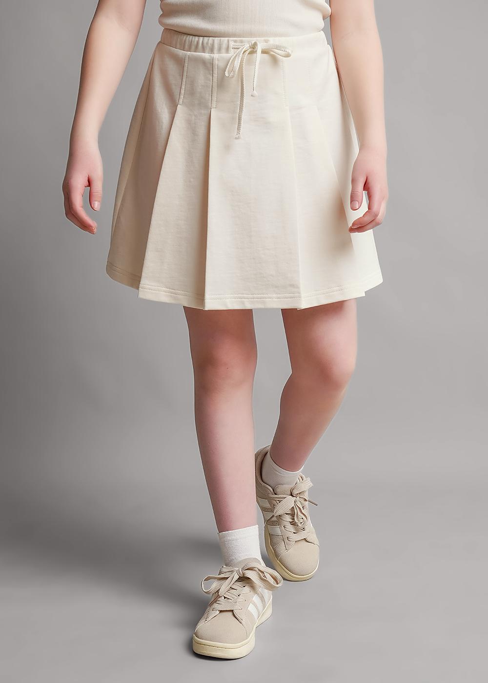 Стильная юбка из футера с симметричными складками по переду, оформленными отстрочкой. Для удобства и хорошей посадки в поясе предусмотрена резинка и шнурок для регулировки.