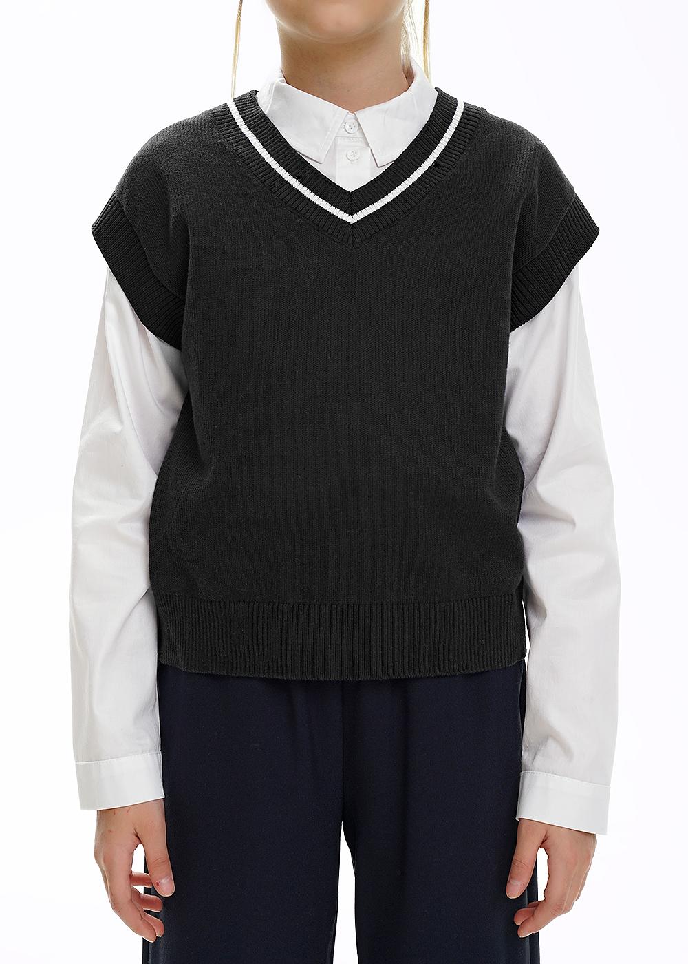 Стильный жилет для девочки в стиле оверсайз из хлопка с добавлением акрила. Прямой силуэт увеличенного объема, V-образный вырез горловины, украшенный контрастной полосой. Модель отлично впишется в школьные и в повседневные образы.