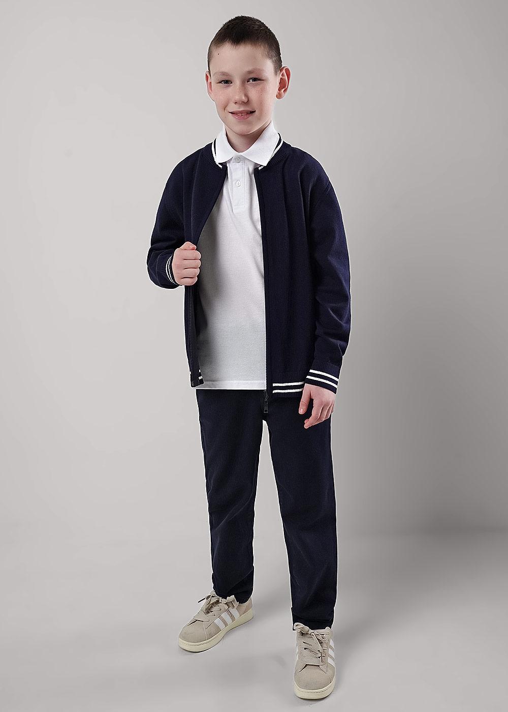 Базовый бомбер из хлопковой пряжи для мальчика. Застежка- молния, по низу рукавов и изделия эластичная вязка, украшенная декоративными полосками.