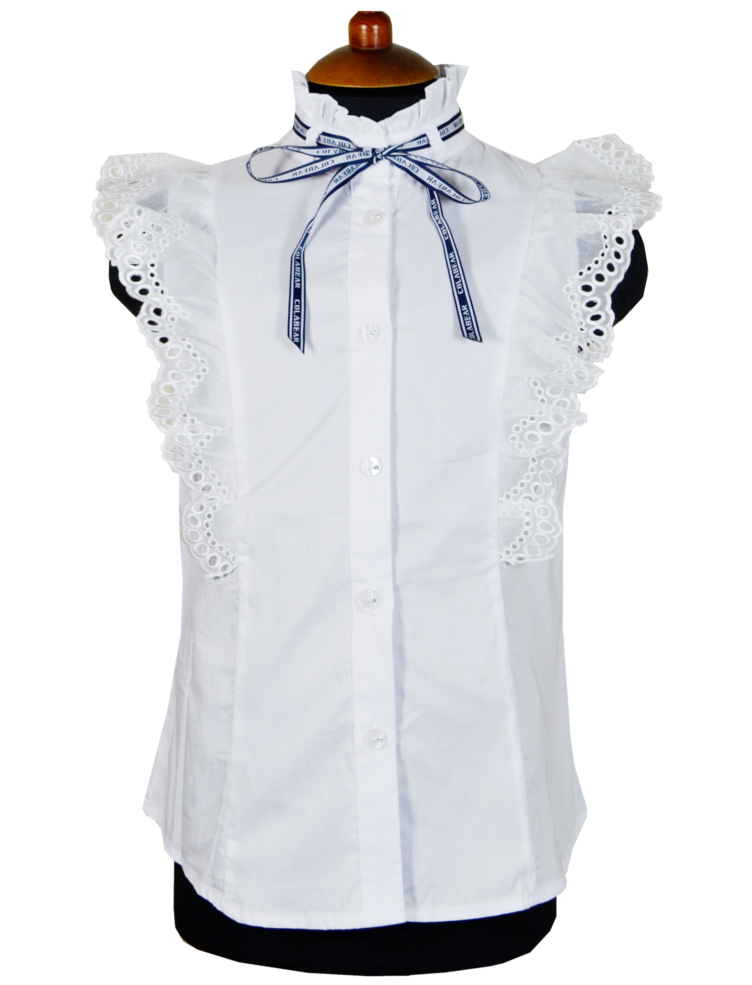 Блузка для девочки с воротником стойкой. Крылышки из плотной органзы с кружевом. Приталенный крой.  Спинка изделия без особенностей. Лента в комплекте.