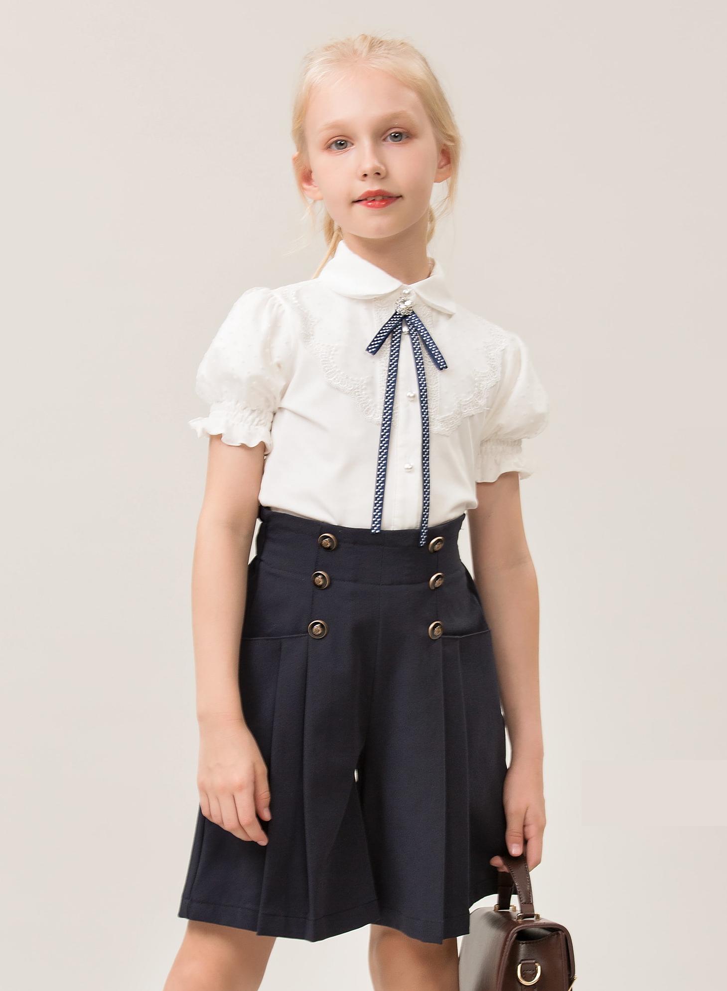 Блузка для девочек из трикотажной ткани с добавлением эластана. Рукав-фонарик в два слоя из трикотажного полотна и сетчатого трикотажа с рисунком. Полочка дополнена кружевным полотном. Рукав хорошо держит форму. Застежка на пуговицы.  Воротник из блузочкой ткани. Брошь в комплекте. Качество изделия очень высокое.  Очень нарядная и удобная.