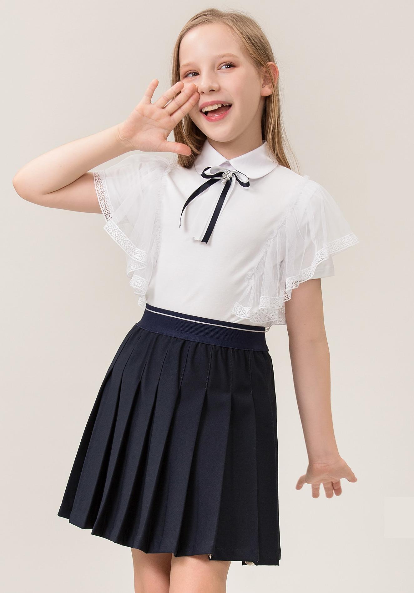 Блузка для девочек из трикотажной ткани с добавлением эластана. Рукав-крыло в два слоя, первый слой из основной трикотажной ткани. второй слой из сетчатого трикотажа с кружевной тесьмой. Рукав хорошо держит форму. Застежка-капелька на пуговицу по спинке.  Воротник из блузочкой ткани с закругленными концами. Брошь в комплекте. Качество изделия очень высокое.