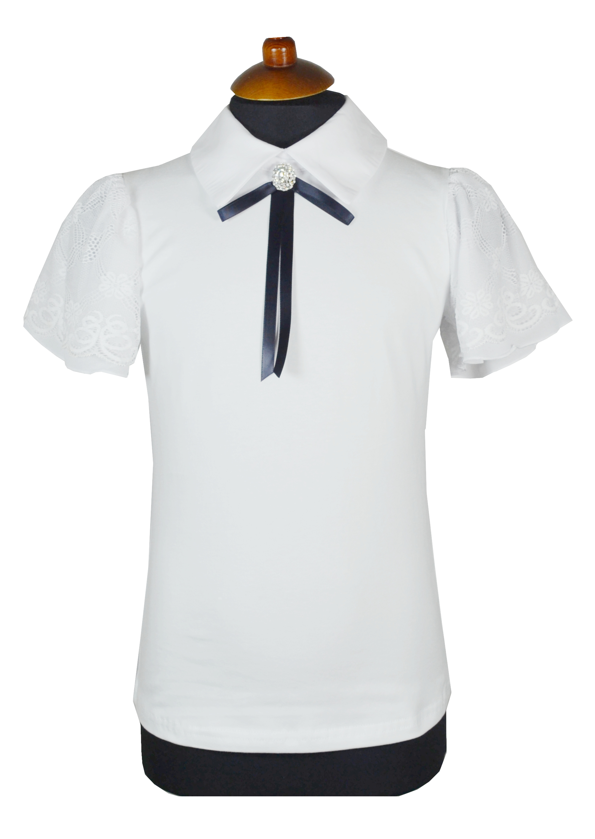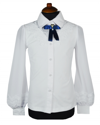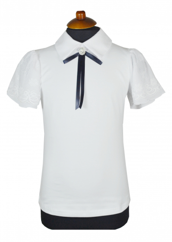 Блузка для девочек из трикотажной ткани с добавлением эластана. Рукав-крыло в два слоя из шифона и сетчатого трикотажа с вышивкой. Рукав хорошо держит форму. Застежка-капелька на пуговицу по спинке.  Воротник из блузочкой ткани. Брошь в комплекте. Качество изделия очень высокое.
