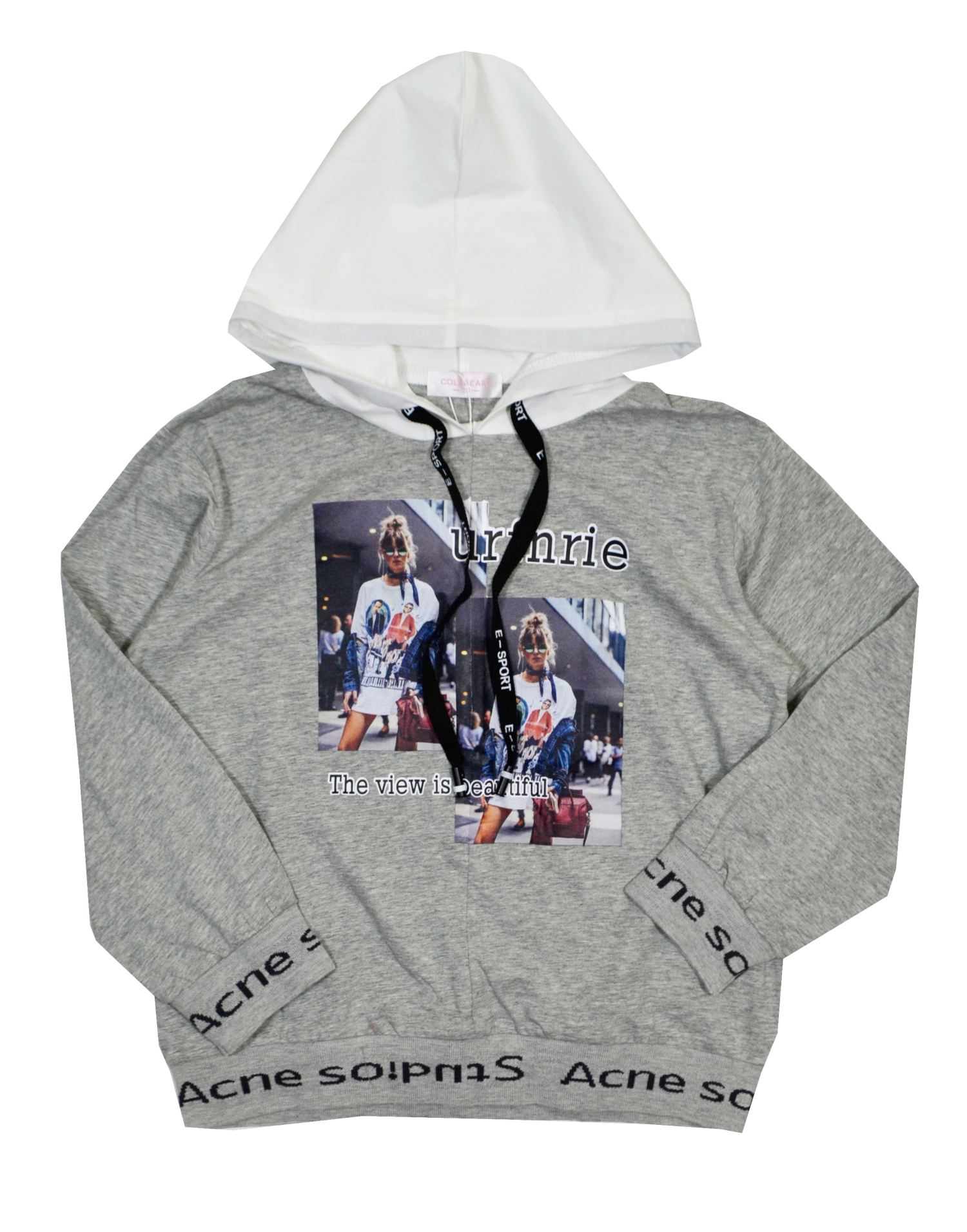 Тонкий джемпер для девочки с капюшоном. Капюшон дополнен шнурком. Рукав 7/8 для закатывания до локтя. Дополнен джемпер принтом. Очень стильная вещь, в размер.