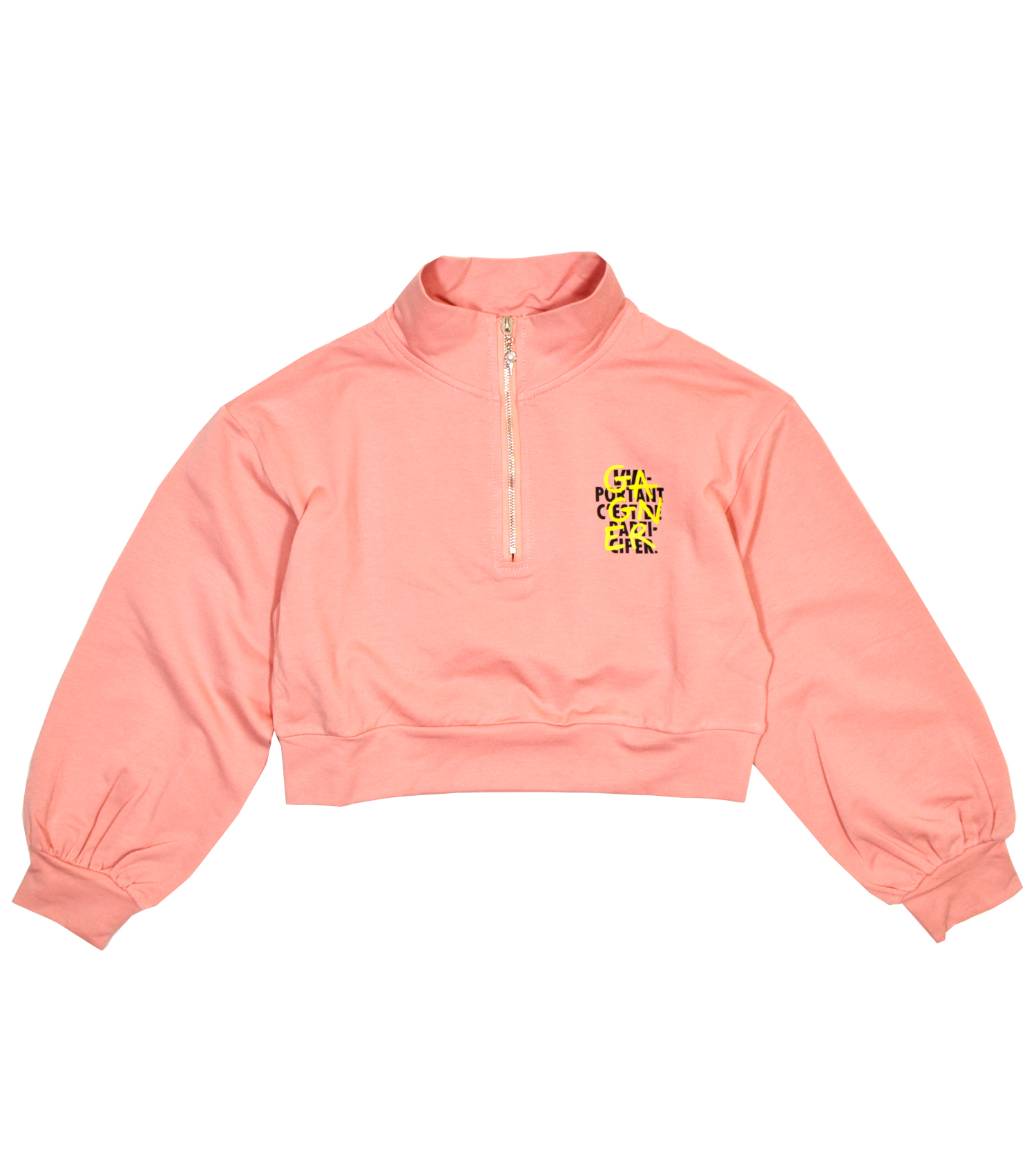 Джемпер для девочки из трикотажного полотна. Ткань без начеса. Воротник стойка с застежкой на замок. Дополнен принтом. Модный укороченный крой. Рукав широкий и собран на резинку.   Спинка без особенностей. В размер. Очень стильная вещь. Цвет красивый, больше похож на припыленный розовый.