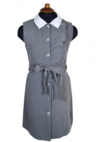 Сарафан для девочки из плотной костюмной ткани. Сарафан притален, есть вытачки по спинке.  Белый воротник отстегивается. Практичная вещь на каждый день в школе, отлично переносит стирку. Используется высококачественная ткань, которая не мнется, не линяет и не тускнеет, даже при частых стирках.  Пошив безупречный. Застежка на пуговицы. Пояс в комплекте.