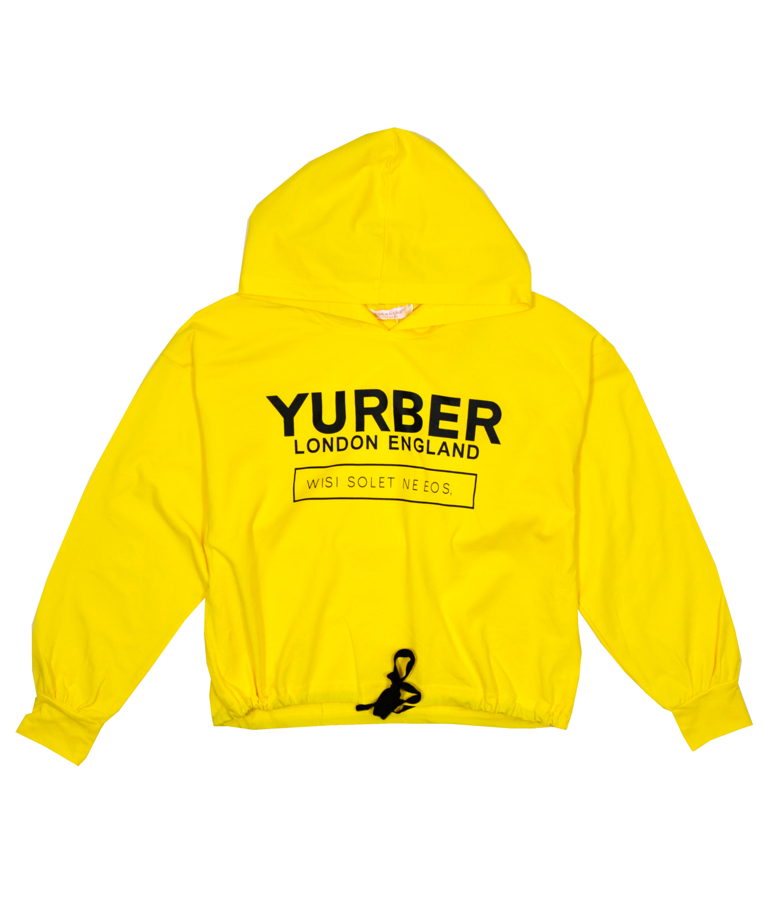 Яркий свитшот для девочки с капюшоном. Дополнен принтом. По низу регулируется тесьмой черного цвета. Спинка без особенностей.