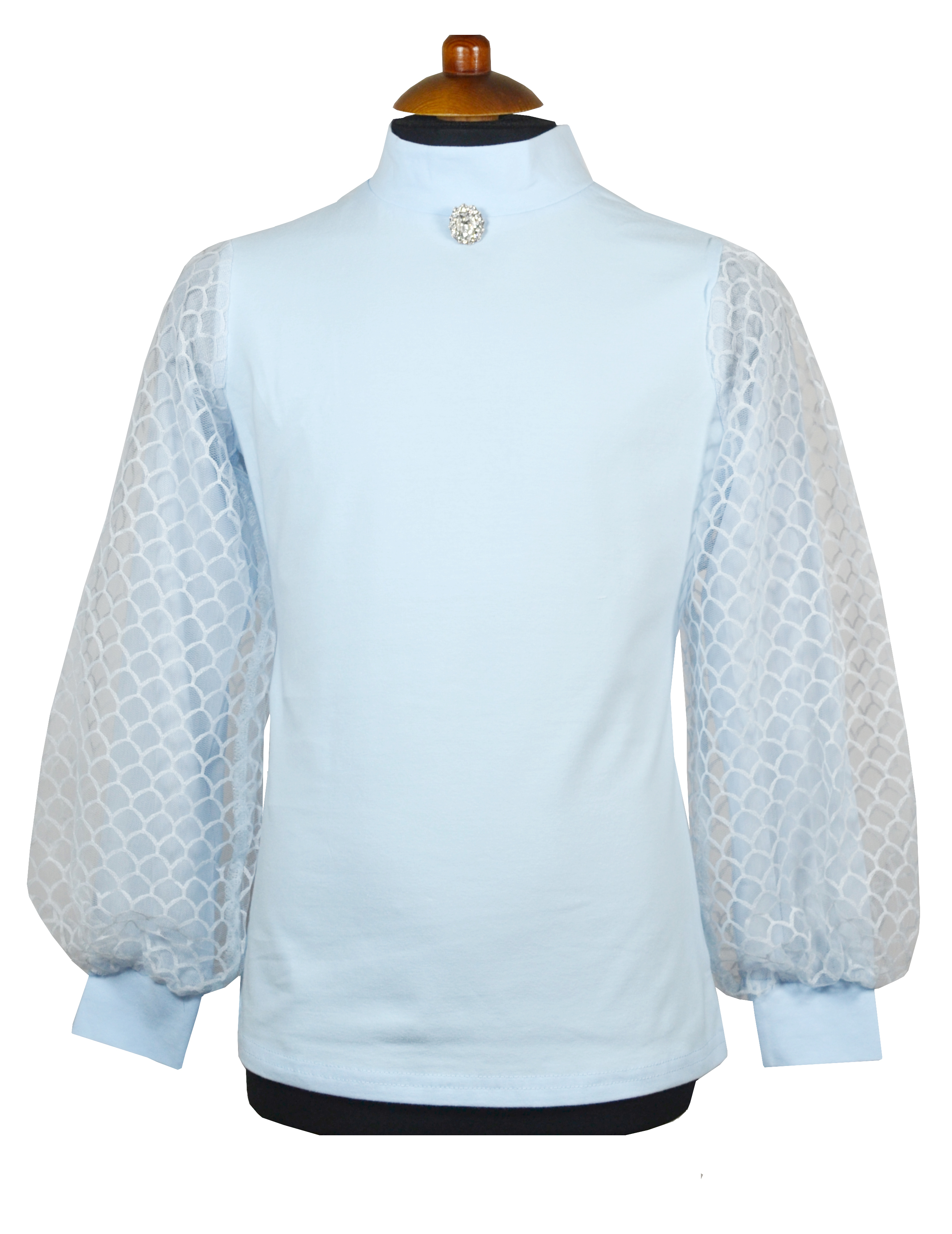 Водолазка для девочек из трикотажной ткани с добавлением эластана. Воротник стойка. Рукав выполнен в два слоя из сетчатого трикотажного полотна. Брошь в комплекте.