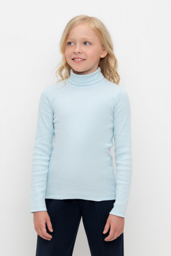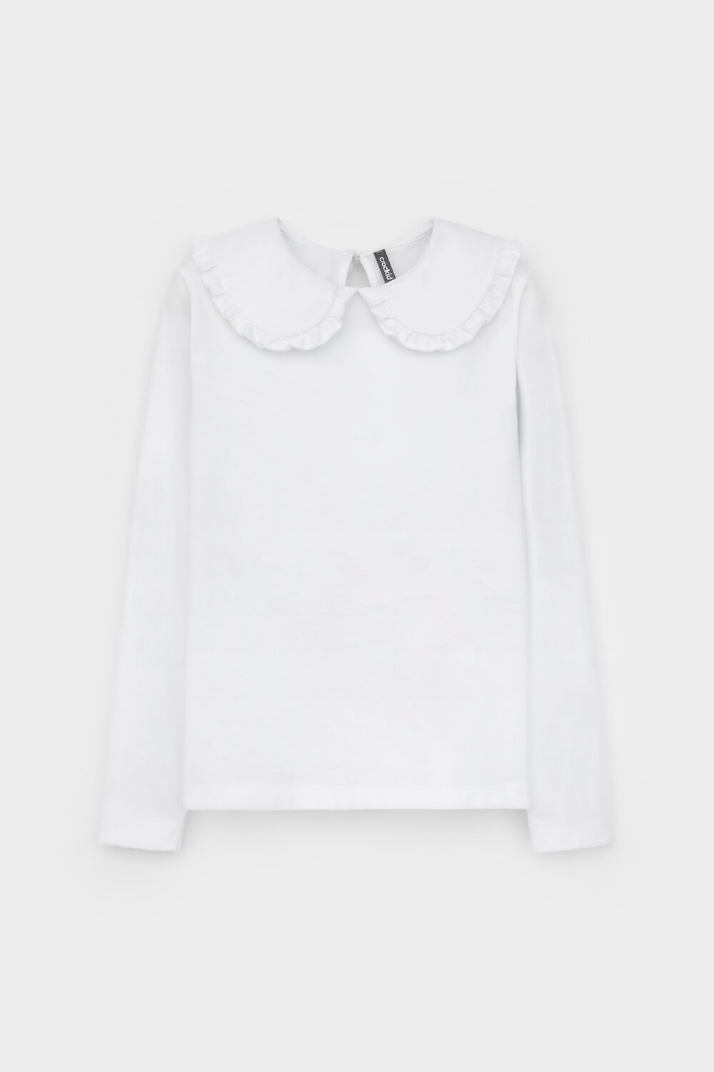 Блузка школьная для девочки с отложным воротником из трикотажа супрем. Застёгивается на пуговицу и петельку из шляпной резины. Воротник украшен оборкой. Рукава и низ изделия обработаны плоскими швами.
