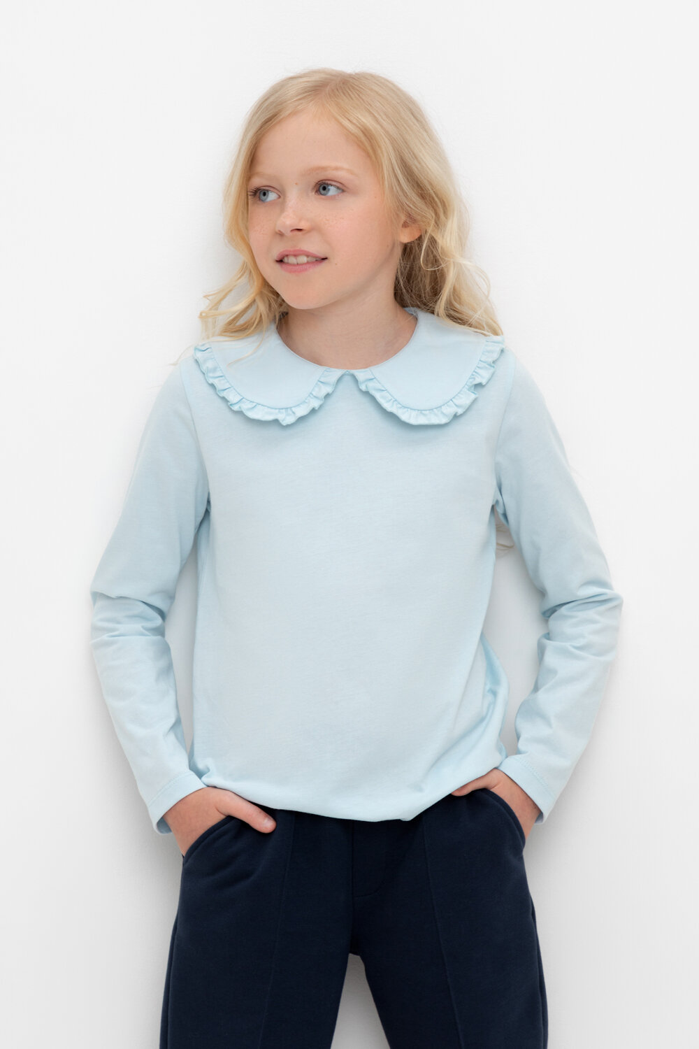 Блузка школьная для девочки с отложным воротником из трикотажа супрем. Застёгивается на пуговицу и петельку из шляпной резины. Воротник украшен оборкой. Рукава и низ изделия обработаны плоскими швами.