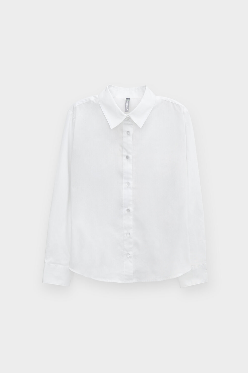 Классическая блузка для девочки с отложным воротником. Застегивается спереди на планку с пуговицами. Длинные втачанные рукава с манжетами регулируются по ширине.