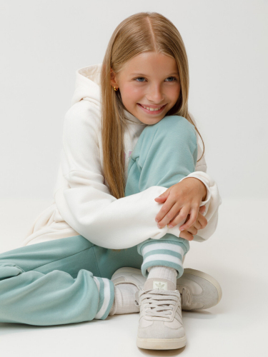 Бомбер для девочки с контрастными рукавами из мягкого трикотажа. Воротник, манжеты и пояс - вязаные. Спереди карманы с листочкой.