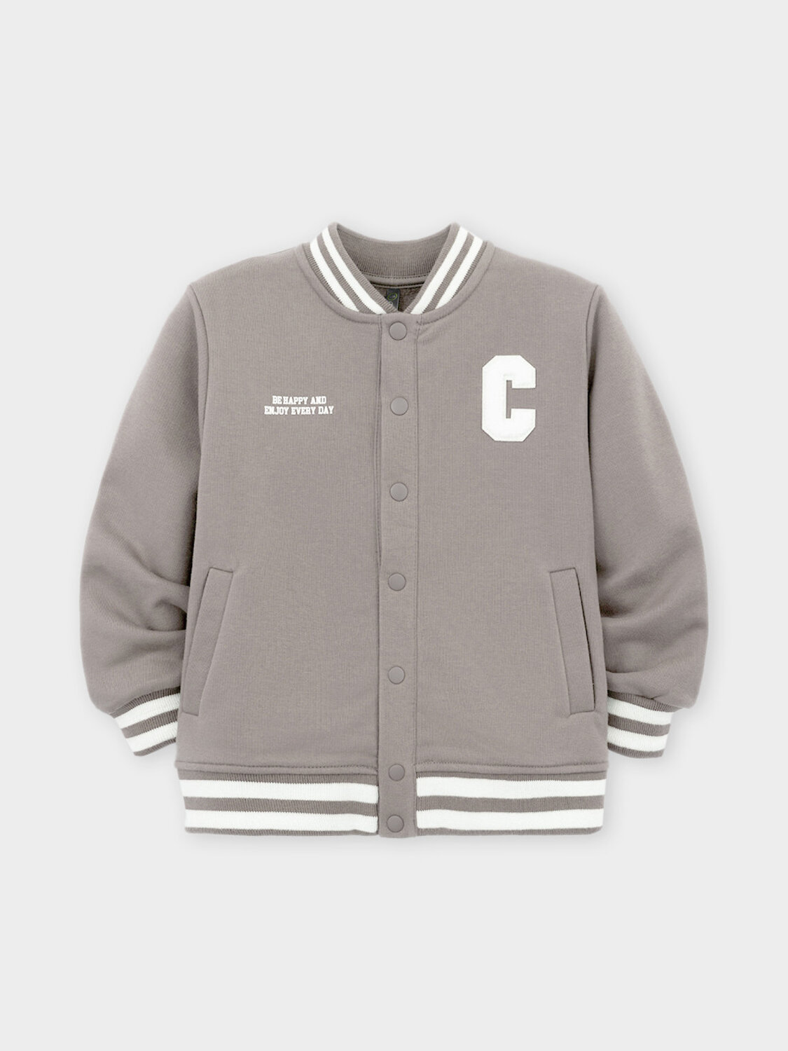 Бомбер с контрастными рукавами для мальчика. Изготовлен из мягкого петельчатого трикотажа. Застёгивается на кнопки. Воротник, манжеты и пояс - вязаные. Спереди карманы с листочкой.