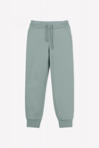 Трикотажные брюки для мальчика из петельчатого футера. Эластичный пояс на резинке регулируется по ширине с помощью шнурка, по бокам два удобных кармана, внизу эластичные манжеты.