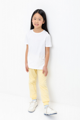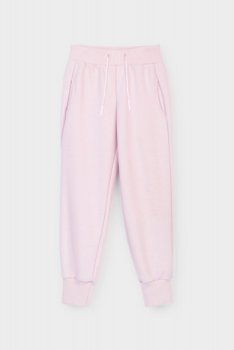 Трикотажные брюки для девочки из петельчатого футера. Эластичный пояс на резинке регулируется по ширине с помощью шнура, по бокам два удобных кармана, внизу эластичные манжеты.