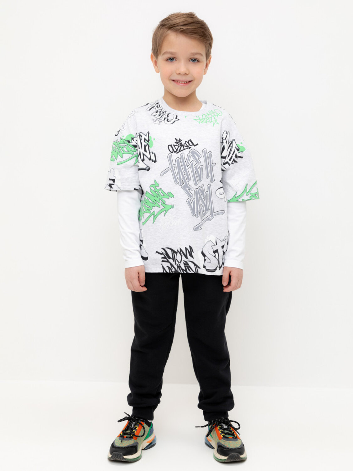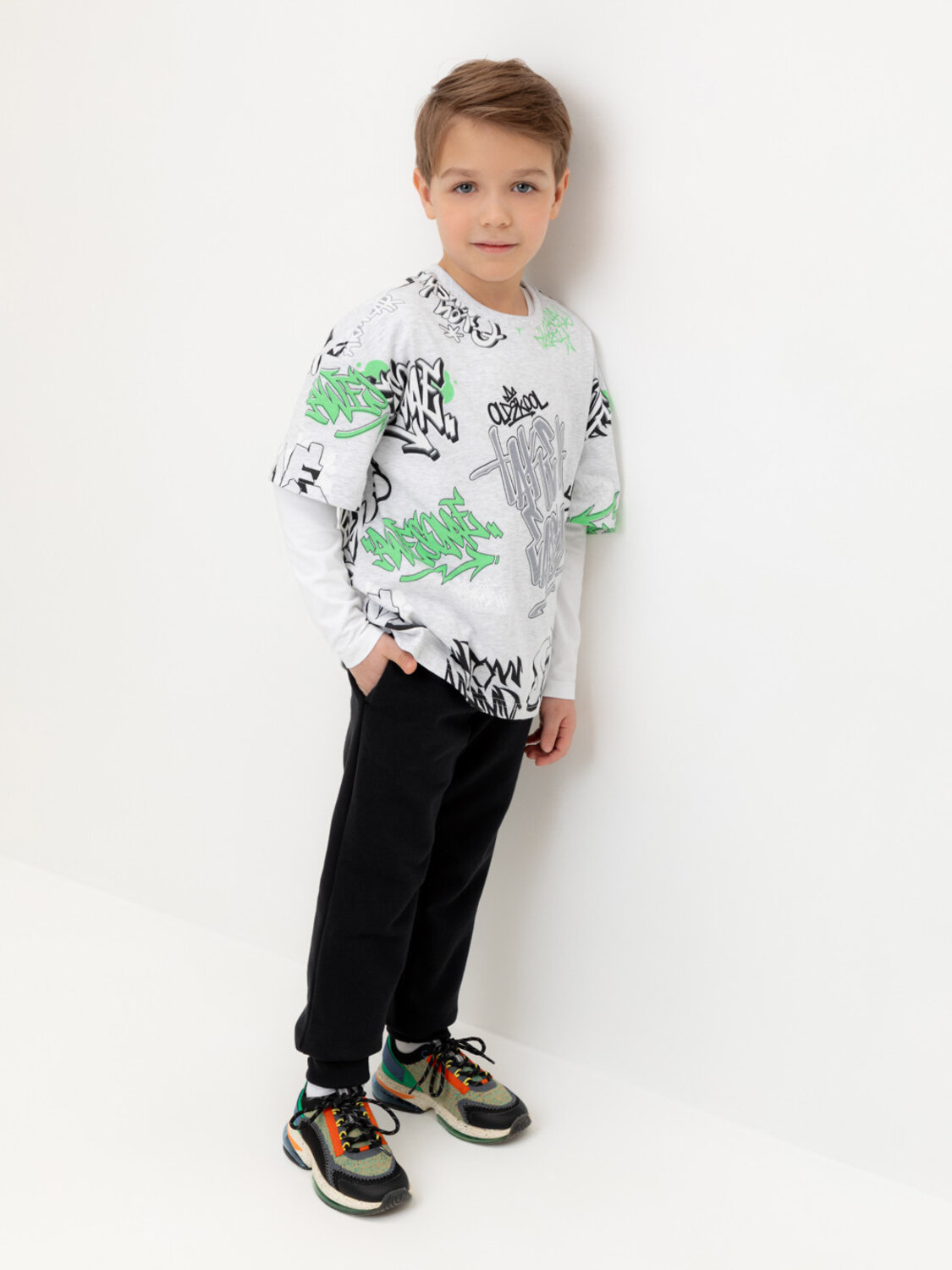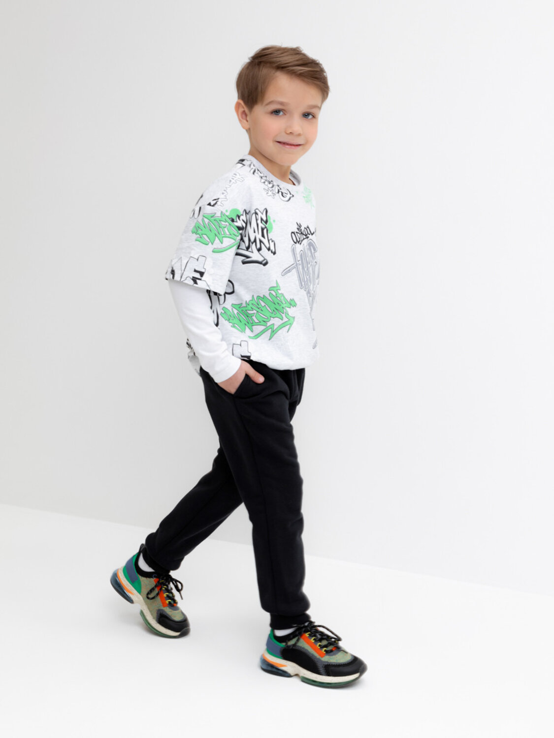 Трикотажные брюки для мальчика из мягкого футера с начесом. В составе 80% натурального хлопка и 20% полиэстера, при этом полиэстер ввязан внутрь по особой технологии и не соприкасается с кожей. Эластичный пояс на резинке регулируется по ширине с помощью шнурка, внизу эластичные манжеты.