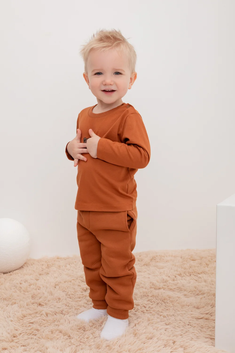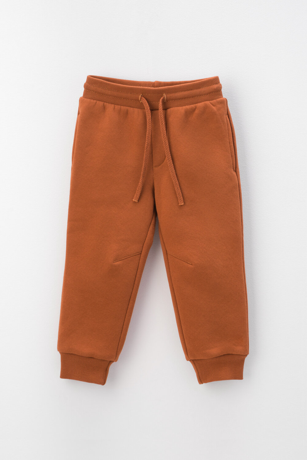 Трикотажные брюки для мальчика из петельчатого футера. Эластичный пояс на резинке регулируется по ширине с помощью шнурка, по бокам два удобных кармана, внизу эластичные манжеты.