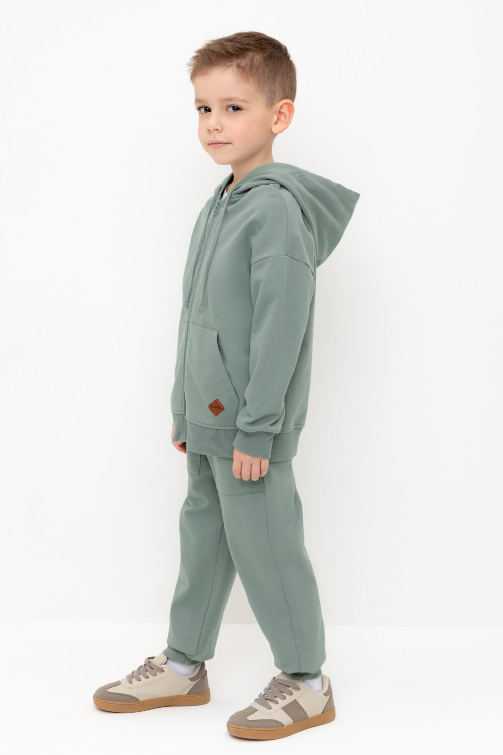 Брюки для мальчика из мягкого петельчатого трикотажа. Эластичный пояс на резинке регулируется по ширине с помощью шнурка. По бокам два удобных накладных кармана. Внизу эластичные манжеты.