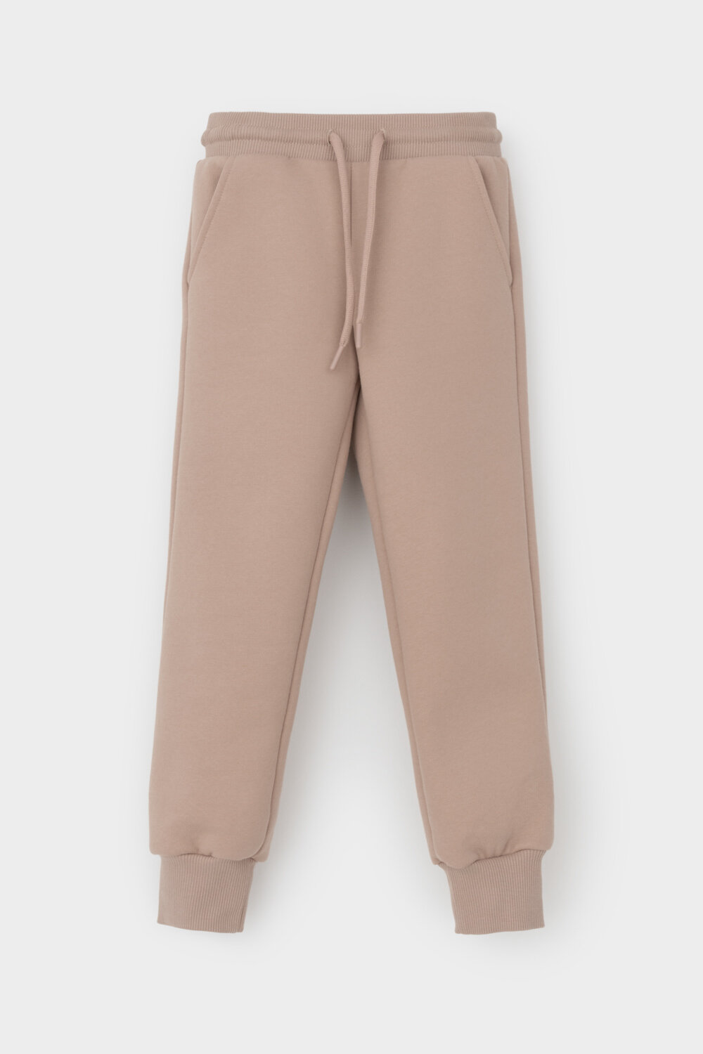 Трикотажные брюки для девочки из футера трехнитки с начесом. Эластичный пояс на резинке регулируется по ширине с помощью шнурка, внизу манжеты из эластичного кашкорсе.