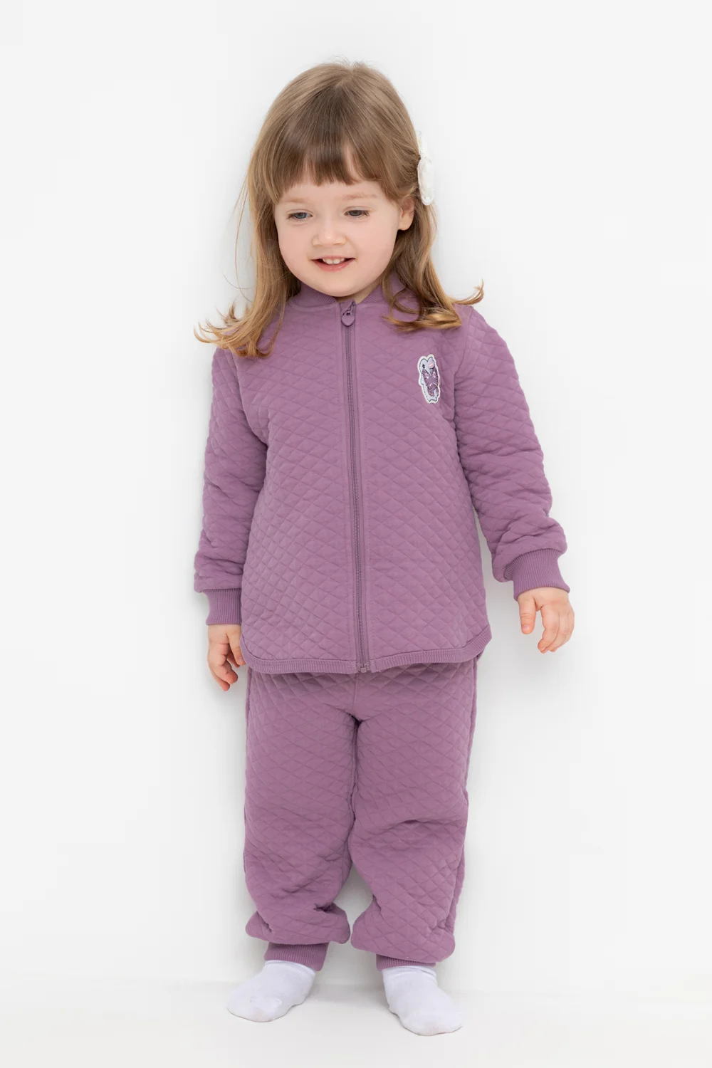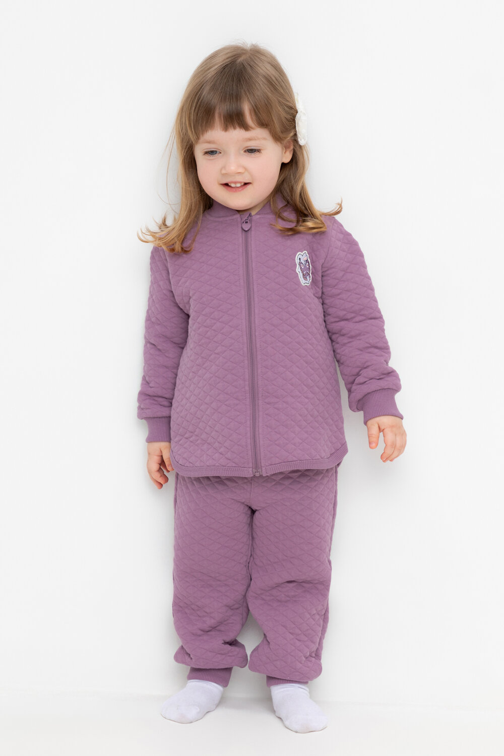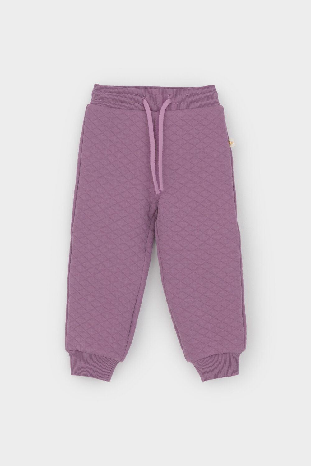 Трикотажные брюки для девочки из стеганого трикотажного полотна. Эластичный пояс на резинке регулируется по ширине с помощью шнурка, внизу манжеты на резинке.