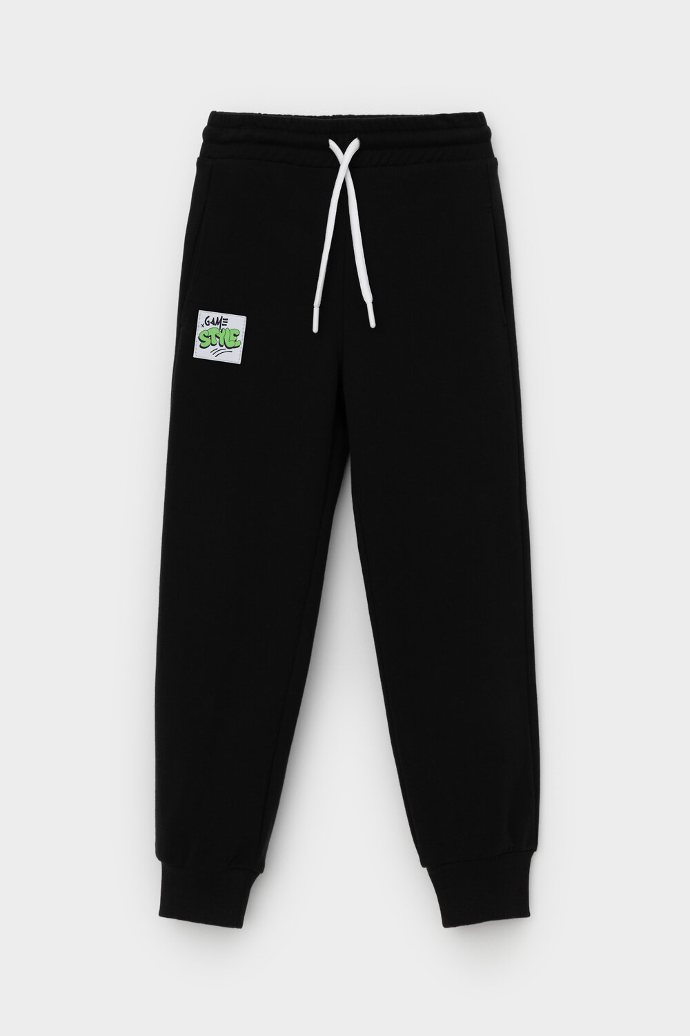 Объёмные брюки для мальчика из мягкого петельчатого трикотажа. Эластичный пояс на резинке регулируется по ширине с помощью шнурка, по бокам два удобных кармана, внизу эластичные манжеты.