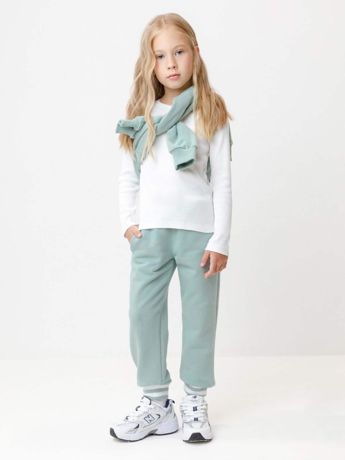 Брюки для девочки из мягкого петельчатого трикотажа. В составе 80% натурального хлопка и 20% полиэстера, при этом полиэстер ввязан внутрь по особой технологии и не соприкасается с кожей. Эластичный пояс на резинке регулируется по ширине с помощью шнурка, по бокам два удобных кармана, внизу эластичные манжеты.