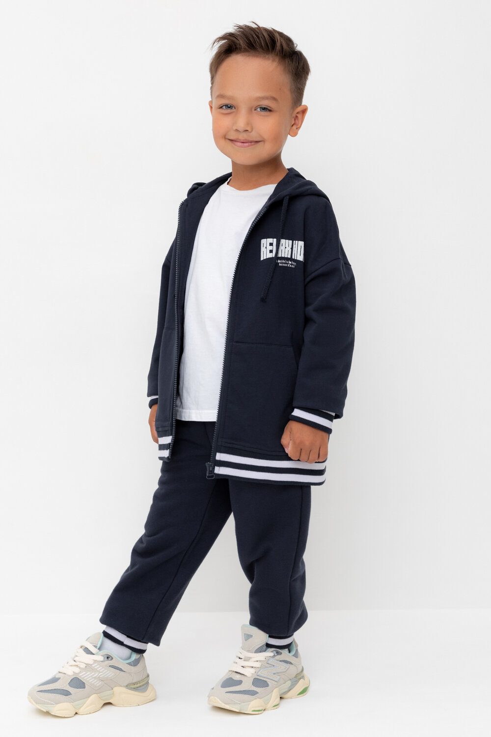 Объёмные брюки для мальчика из мягкого петельчатого трикотажа. В составе 80% натурального хлопка и 20% полиэстера, при этом полиэстер ввязан внутрь по особой технологии и не соприкасается с кожей. Эластичный пояс на резинке регулируется по ширине с помощью шнурка, по бокам два удобных кармана, внизу эластичные манжеты.