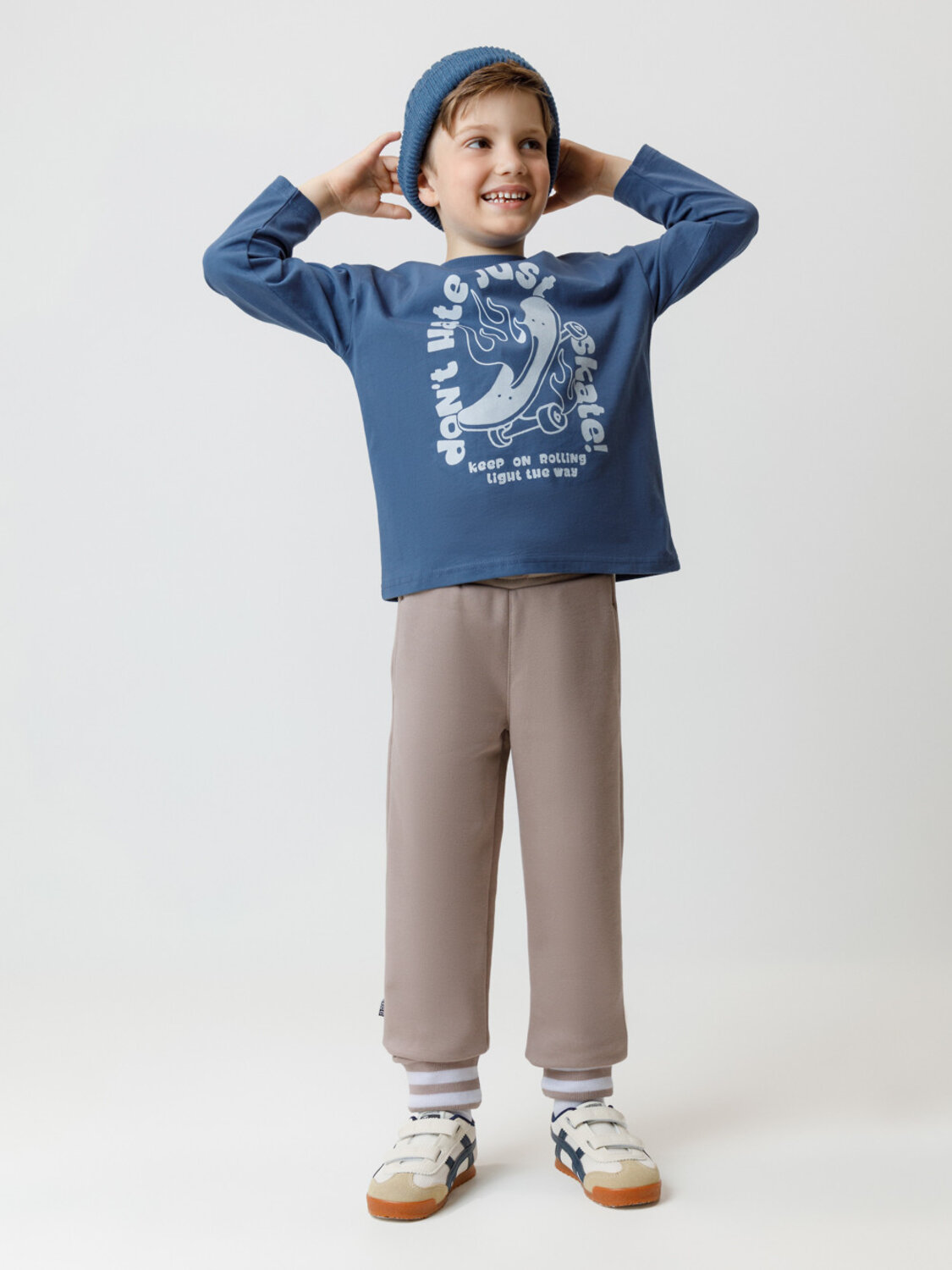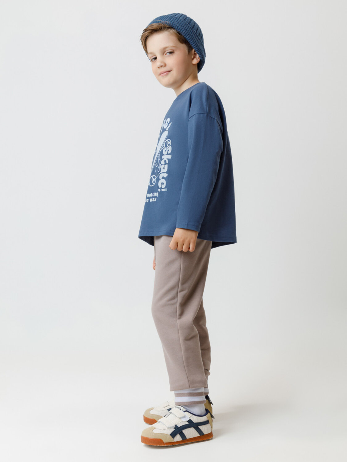 Объёмные брюки для мальчика из мягкого петельчатого трикотажа. В составе 80% натурального хлопка и 20% полиэстера, при этом полиэстер ввязан внутрь по особой технологии и не соприкасается с кожей. Эластичный пояс на резинке регулируется по ширине с помощью шнурка, по бокам два удобных кармана, внизу эластичные манжеты.