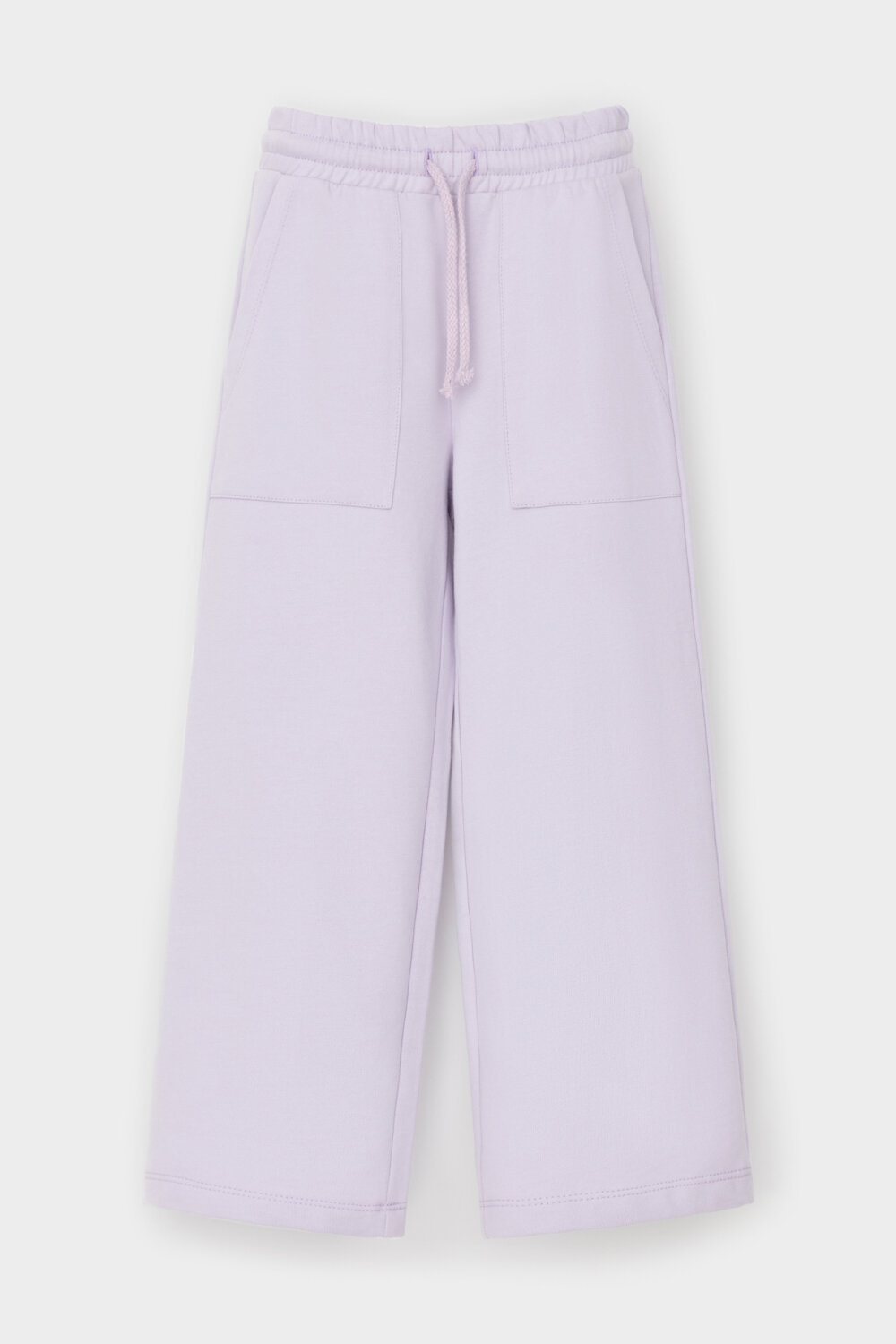 Свободные трикотажные брюки для девочки из петельчатого футера. Эластичный пояс на резинке регулируется по ширине с помощью шнура, по бокам два удобных накладных кармана.