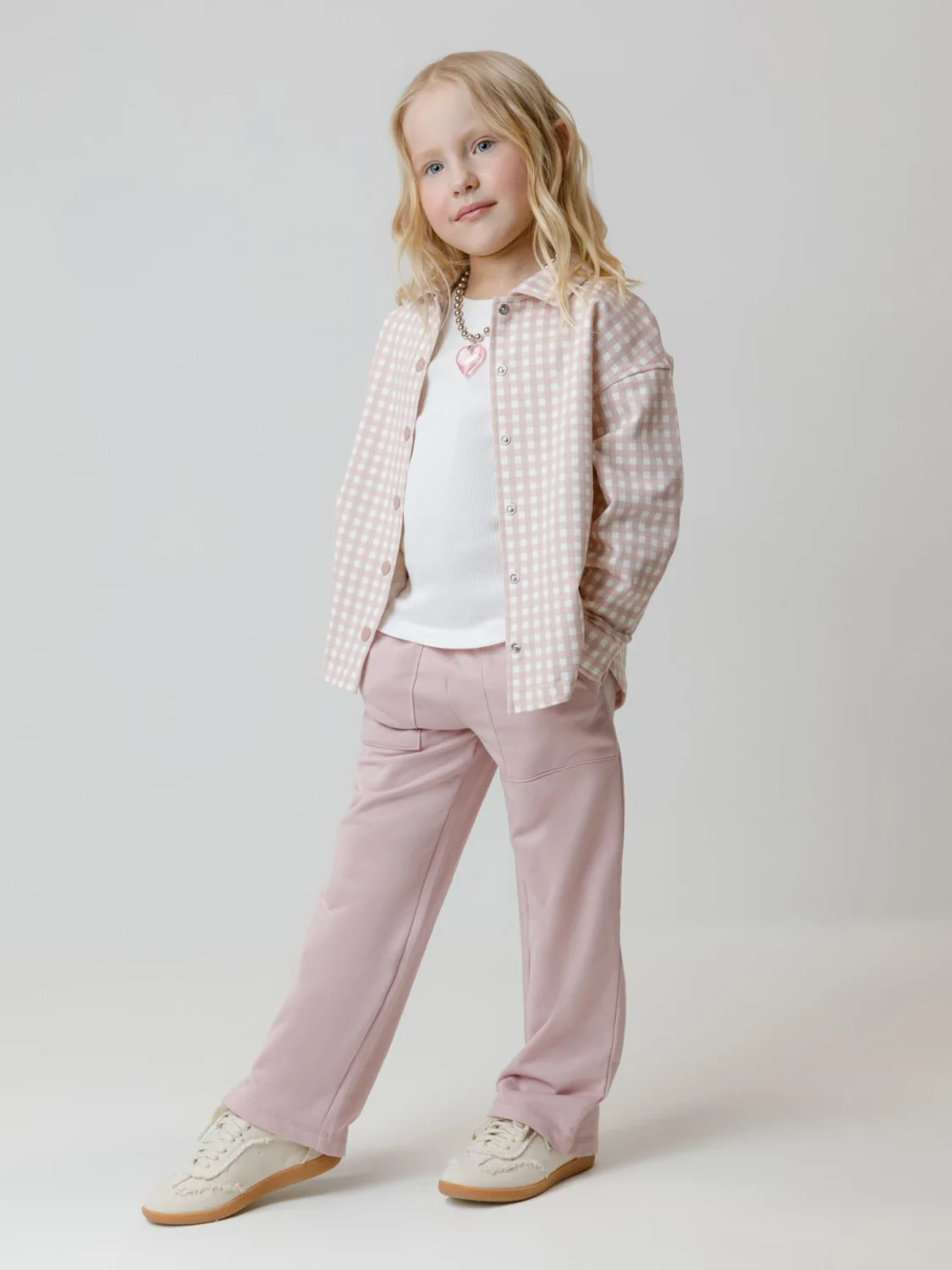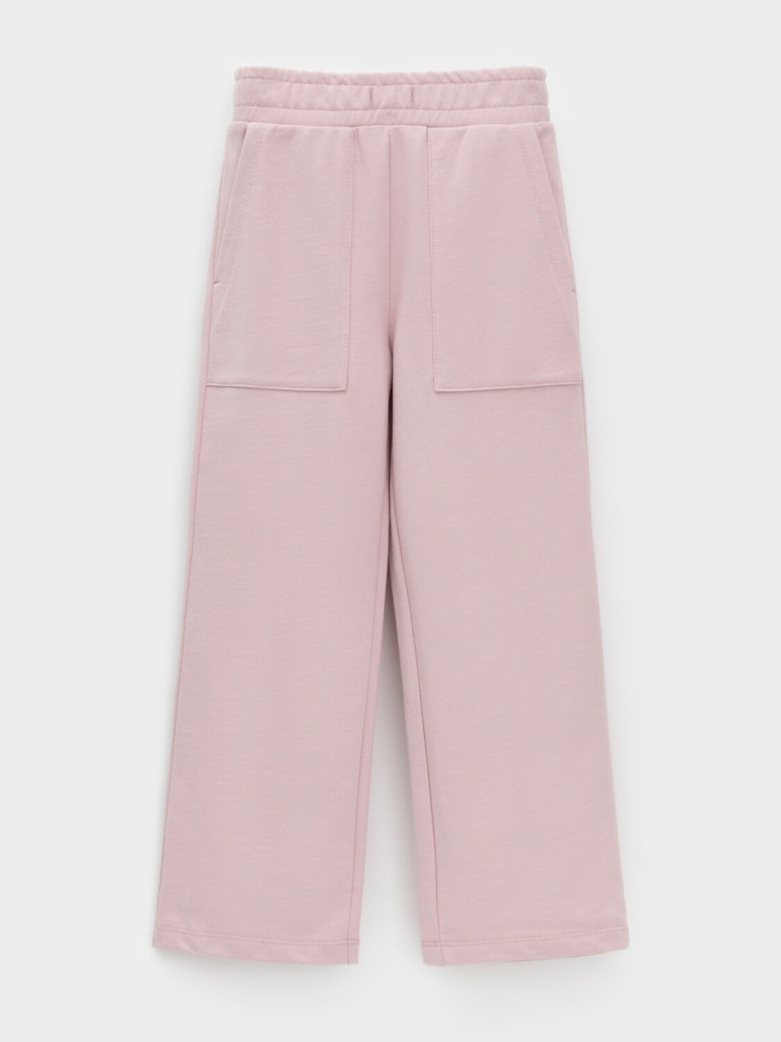 Прямые брюки для девочки из мягкого петельчатого трикотажа. Эластичный пояс на резинке регулируется по ширине с помощью шнурка. По бокам два удобных накладных кармана. Изделие сохраняет цвет и форму после многократных стирок. Все трикотажные полотна производятся в соответствии с нормами швейцарского сертификата ЭкоТекс.
