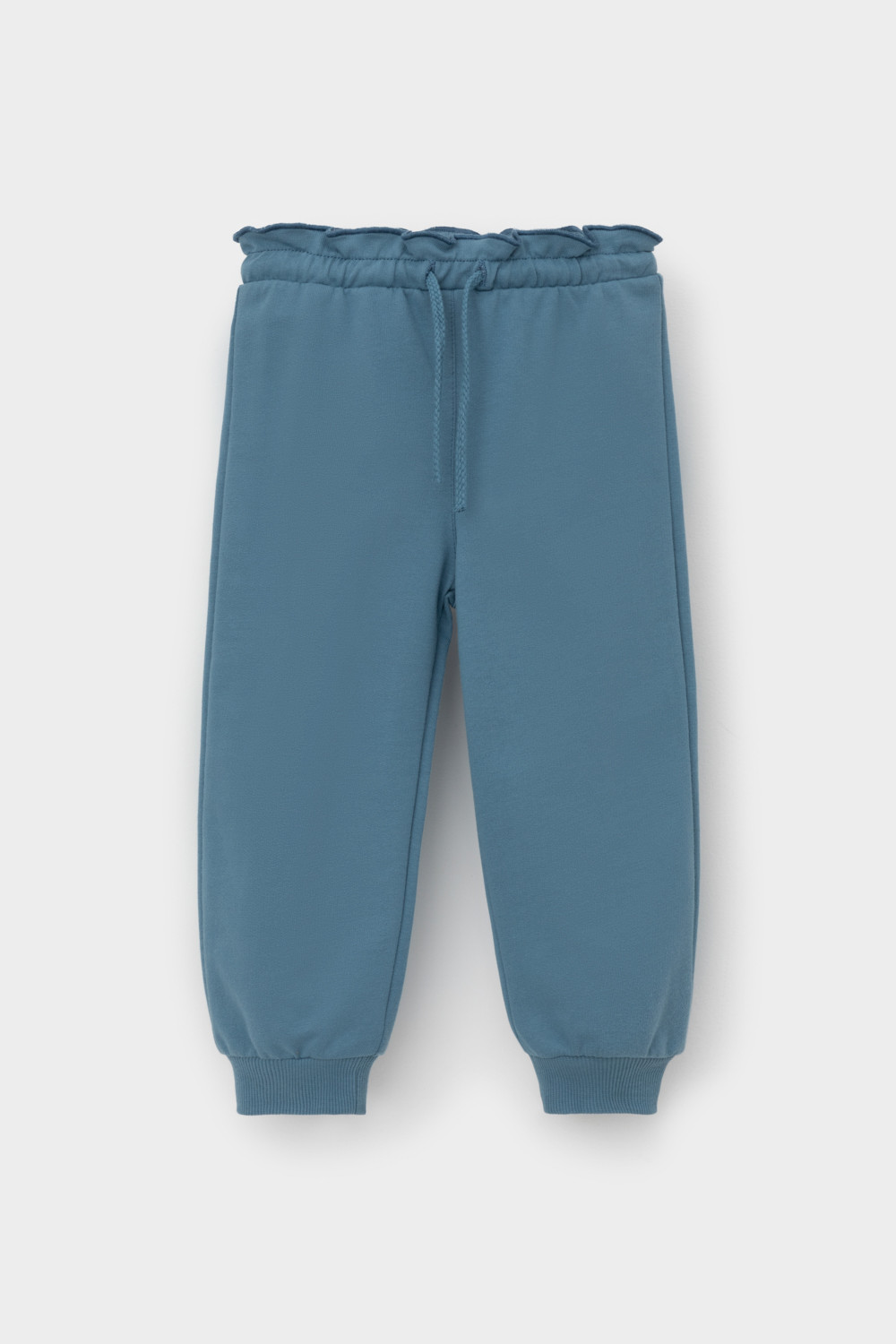 Брюки для девочки из мягкого петельчатого трикотажа. Эластичный пояс на резинке регулируется по ширине с помощью шнурка. Внизу эластичные манжеты.