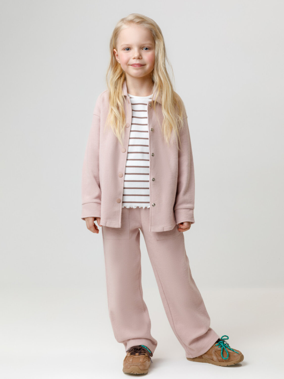 Прямые брюки для девочки из мягкого трикотажа селаник с peach эффектом. Peach эффект достигается с помощью технологии обработки полотна, при которой на его поверхности создаётся лёгкий ворс, напоминающий нежную текстуру кожи персика. Эластичный пояс на резинке регулируется по ширине с помощью шнурка. По бокам два удобных накладных кармана. Изделие сохраняет цвет и форму после многократных стирок. Все трикотажные полотна производятся в соответствии с нормами швейцарского сертификата ЭкоТекс.