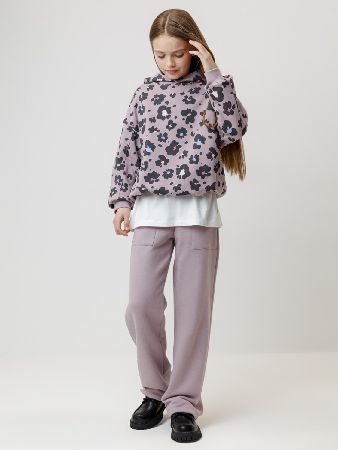 Прямые брюки для девочки из мягкого трикотажа с начёсом. Эластичный пояс на резинке регулируется по ширине с помощью шнурка. По бокам два удобных накладных кармана. Изделие сохраняет цвет и форму после многократных стирок. Все трикотажные полотна производятся в соответствии с нормами швейцарского сертификата ЭкоТекс.