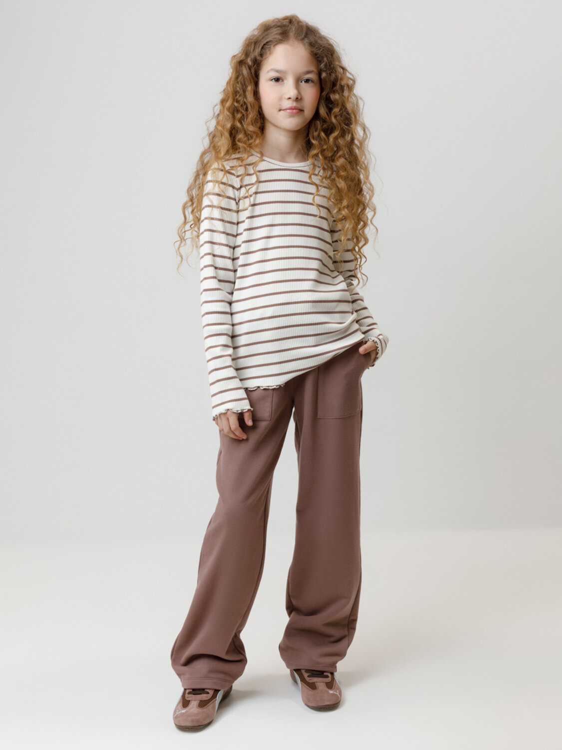 Прямые брюки для девочки из мягкого петельчатого трикотажа. Эластичный пояс на резинке регулируется по ширине с помощью шнурка. По бокам два удобных накладных кармана. Изделие сохраняет цвет и форму после многократных стирок. Все трикотажные полотна производятся в соответствии с нормами швейцарского сертификата ЭкоТекс.