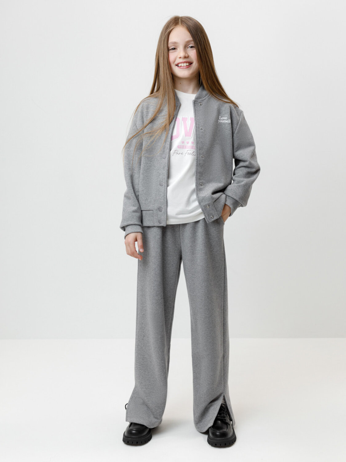 Прямые брюки с разрезами по бокам для девочки из мягкого петельчатого трикотажа. В составе 80% натурального хлопка и 20% полиэстера, при этом полиэстер ввязан внутрь по особой технологии и не соприкасается с кожей. Эластичный пояс на резинке регулируется по ширине с помощью шнурка. По бокам два удобных кармана. Изделие сохраняет цвет и форму после многократных стирок. Все трикотажные полотна производятся в соответствии с нормами швейцарского сертификата ЭкоТекс.