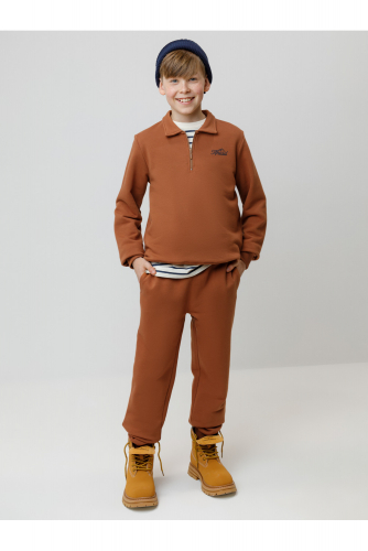 Брюки для мальчика из мягкого петельчатого футера трёхнитки. В составе 80% натурального хлопка и 20% полиэстера, при этом полиэстер ввязан внутрь по особой технологии и не соприкасается с кожей. Модель с эластичным поясом на резинке и утягивающим шнурком для регулировки по талии. По бокам четыре удобных кармана. Низ на манжетах. Изделие сохраняет цвет и форму после многократных стирок. Все трикотажные полотна производятся в соответствии с нормами швейцарского сертификата ЭкоТекс.