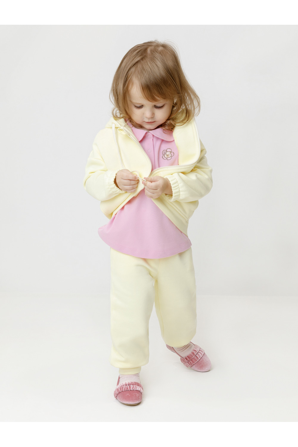 Брюки из мягкого петельчатого футера трёхнитки для девочки. Модель с эластичным поясом на резинке. Низ на манжетах. Изделие сохраняет цвет и форму после многократных стирок. Все трикотажные полотна производятся в соответствии с нормами швейцарского сертификата ЭкоТекс.