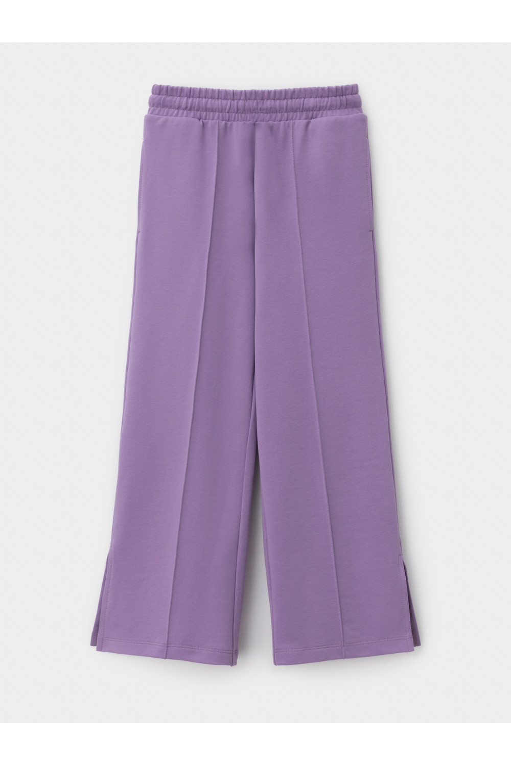 Однотонные брюки со стрелками для девочки. Изготовлены из мягкого петельчатого футера. Модель с эластичным поясом на резинке. Снизу по бокам разрезы. Изделие сохраняет цвет и форму после многократных стирок. Все трикотажные полотна производятся в соответствии с нормами швейцарского сертификата ЭкоТекс.