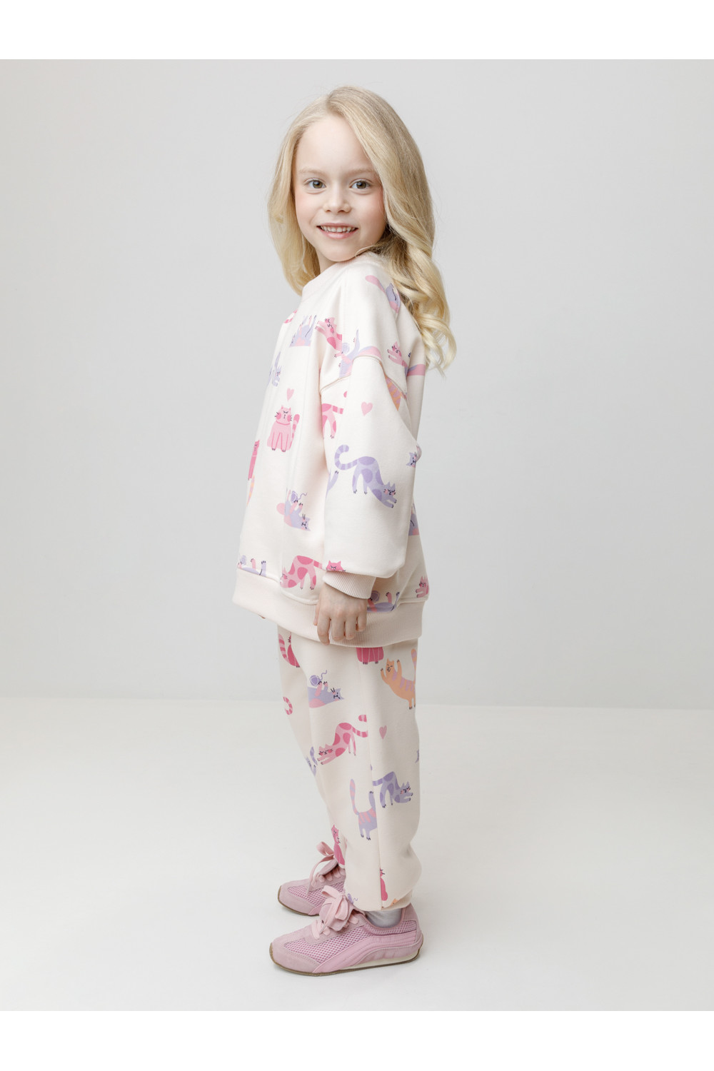 Брюки с оригинальным рисунком для девочки. Изготовлены из мягкого петельчатого футера трёхнитки диагональ. В составе 80% натурального хлопка и 20% полиэстера, при этом полиэстер ввязан внутрь по особой технологии и не соприкасается с кожей. Модель с эластичным поясом на резинке. Низ на манжетах. Изделие сохраняет цвет и форму после многократных стирок. Все трикотажные полотна производятся в соответствии с нормами швейцарского сертификата ЭкоТекс.
