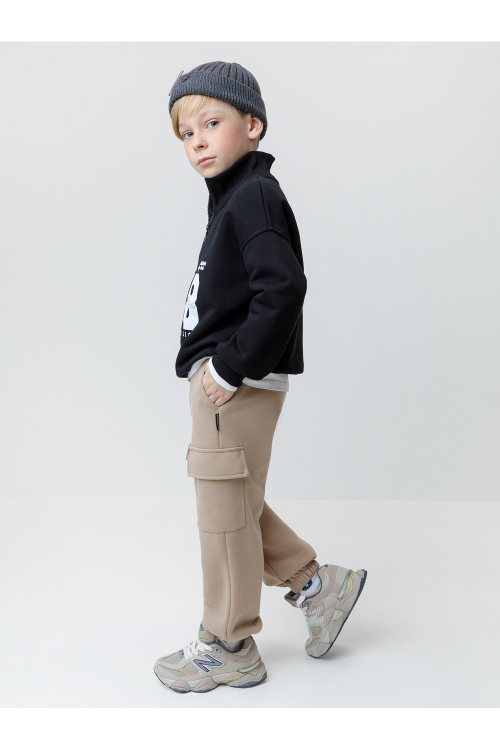 Брюки для мальчика из высококачественного трикотажного полотна. В составе 80% натурального хлопка и 20% полиэстера, при этом полиэстер ввязан внутрь по особой технологии и не соприкасается с кожей. Пояс регулируется по ширине при помощи шнурка. Низ на манжетах. Изделие сохраняет цвет и форму после многократных стирок. Все трикотажные полотна производятся в соответствии с нормами швейцарского сертификата ЭкоТекс.