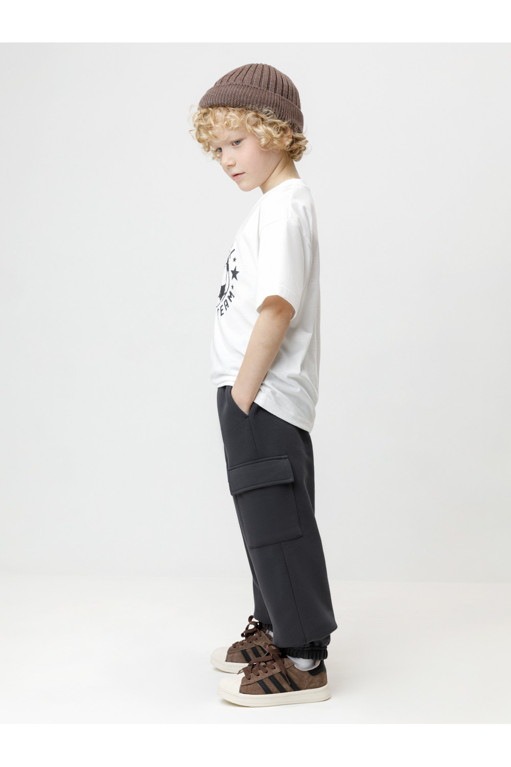 Брюки для мальчика из высококачественного трикотажного полотна. В составе 80% натурального хлопка и 20% полиэстера, при этом полиэстер ввязан внутрь по особой технологии и не соприкасается с кожей. Пояс регулируется по ширине при помощи шнурка. Низ на манжетах. Изделие сохраняет цвет и форму после многократных стирок. Все трикотажные полотна производятся в соответствии с нормами швейцарского сертификата ЭкоТекс.