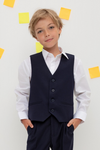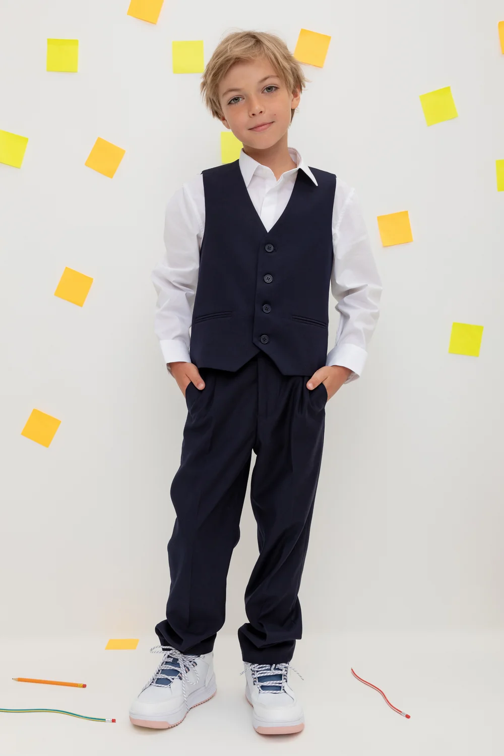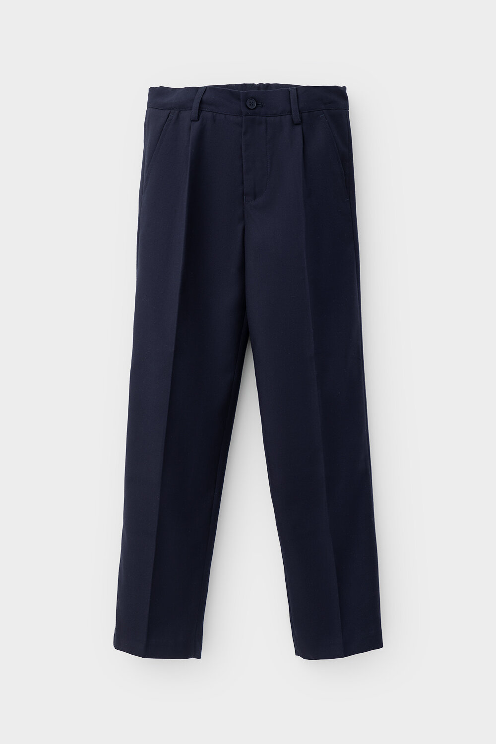 Классические школьные брюки со стрелками для мальчика. Застёгиваются на пуговицу, регулируются по ширине с помощью утяжки на резинку и пуговицы. По бокам и на спинке удобные карманы. По низу брюки обработаны оверлоком.