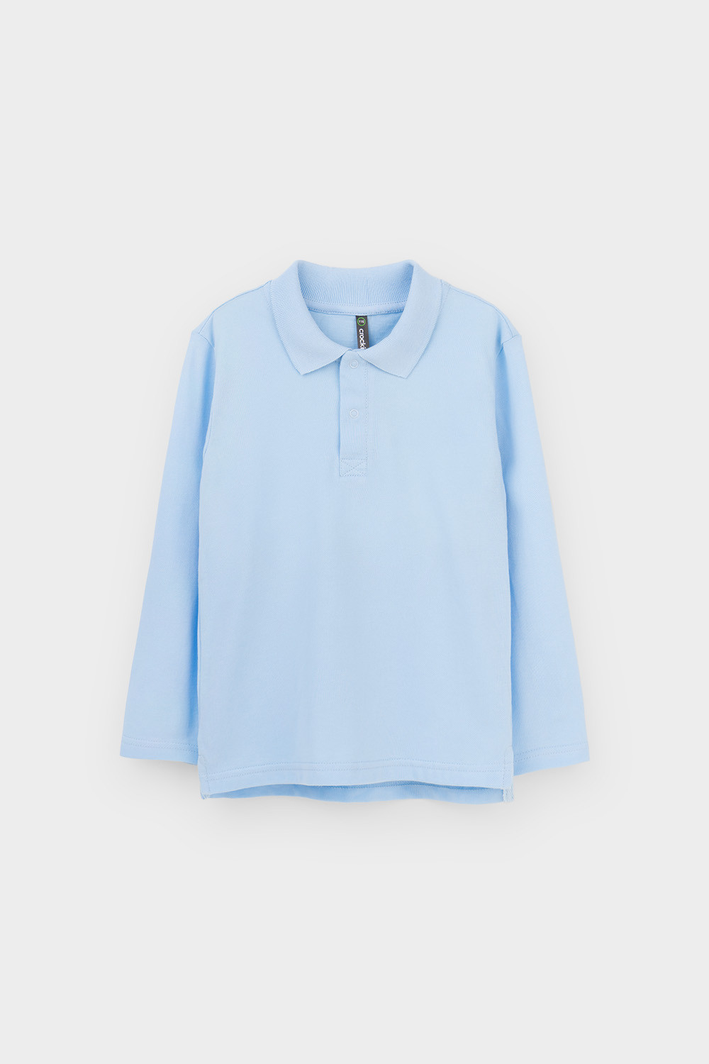 Джемпер поло с длинными рукавами для мальчика из трикотажного полотна пике. Вязаный воротник. Удобная застежка спереди. По бокам разрезы, обработанные киперной лентой.