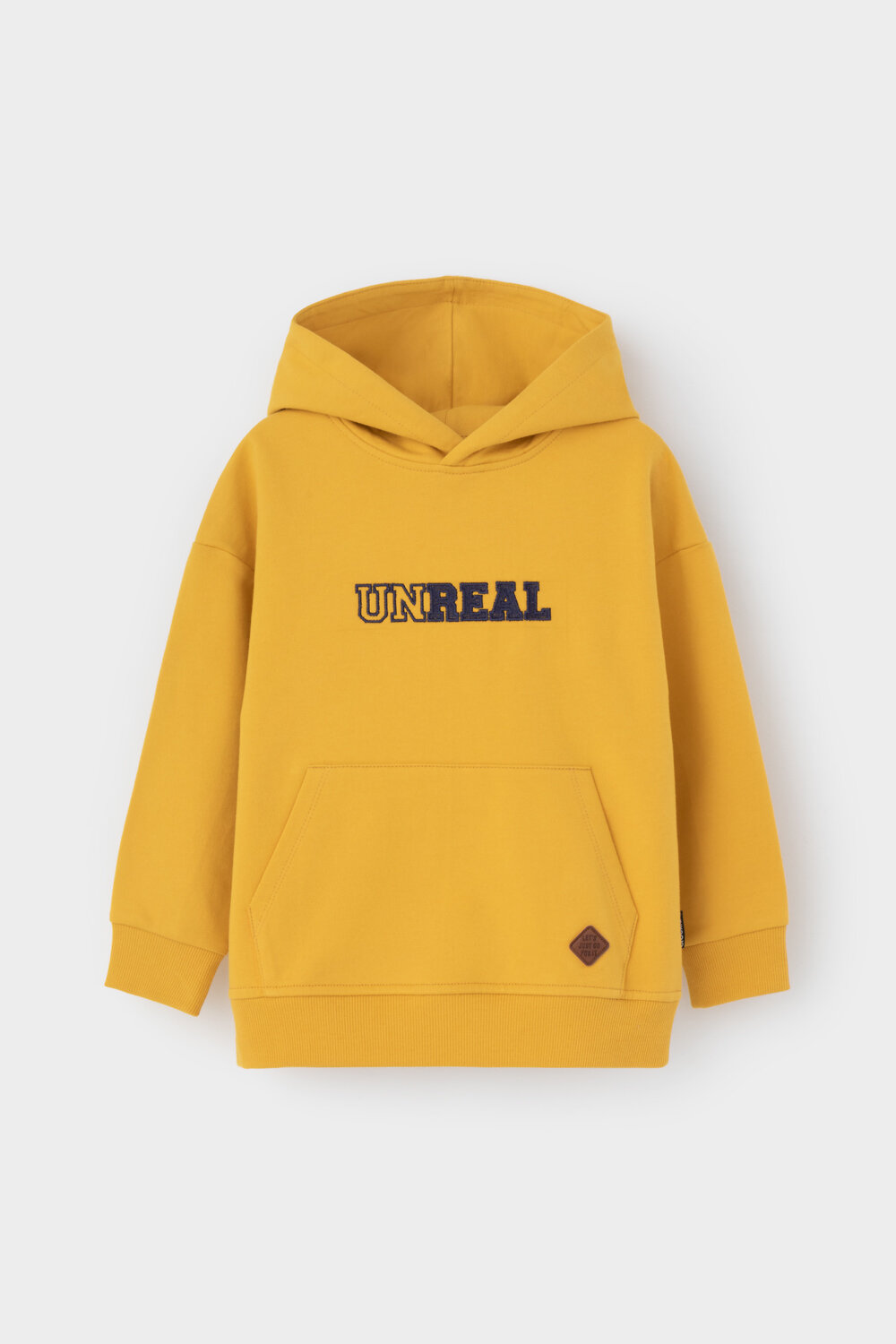 Худи с капюшоном для мальчика из петельчатого футера. Манжеты и пояс выполнены из эластичного полотна. Спереди удобный карман-кенгуру. Спереди вышивка.
