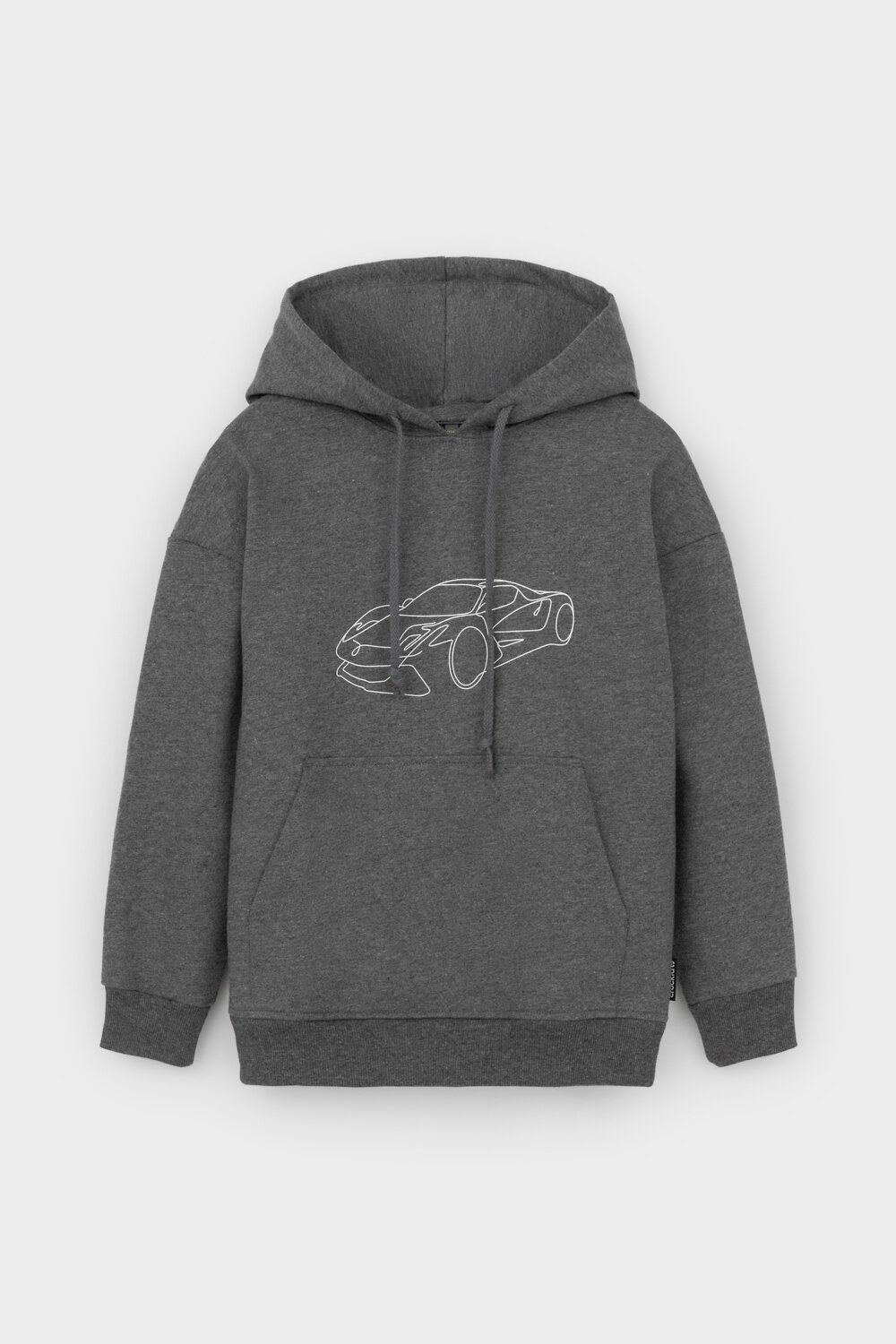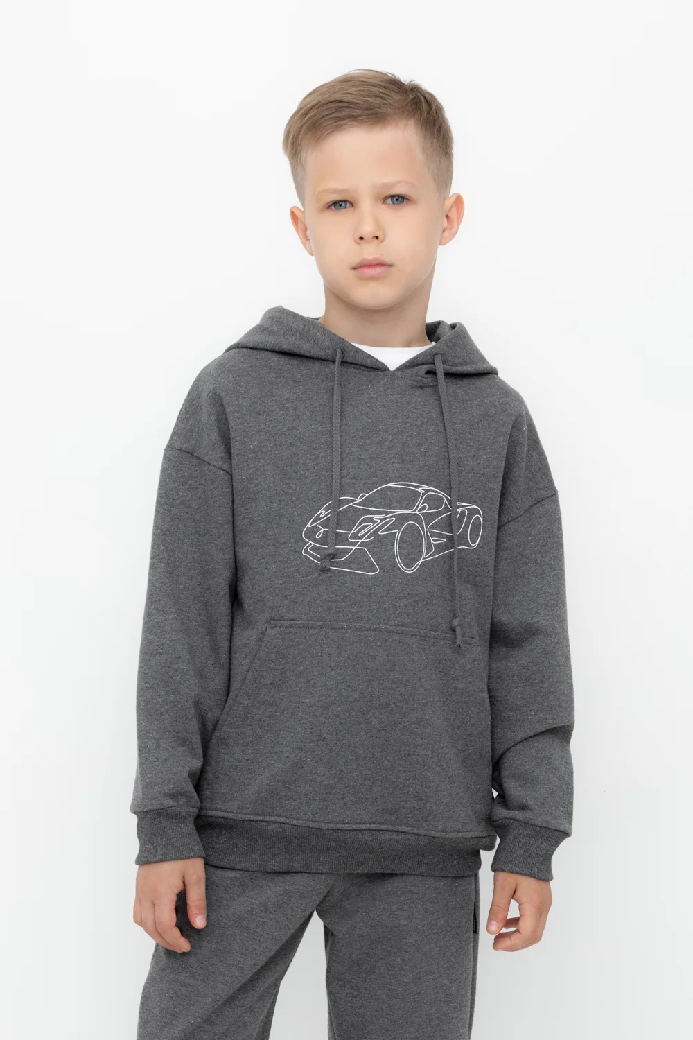 Худи с капюшоном для мальчика из петельчатого футера. Манжеты и пояс выполнены из эластичного полотна. Спереди удобный карман-кенгуру. Украшена принтом.
