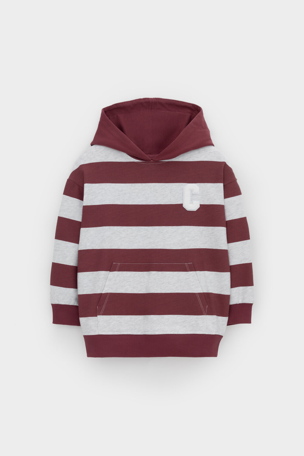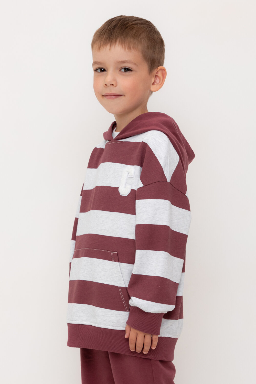 Трикотажное худи с капюшоном из набивного петельчатого футера. Спереди удобный накладной карман-кенгуру. Манжеты и пояс из эластичного трикотажа в рубчик.