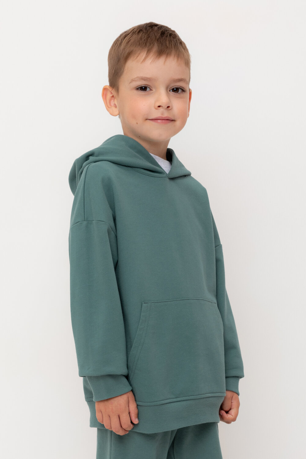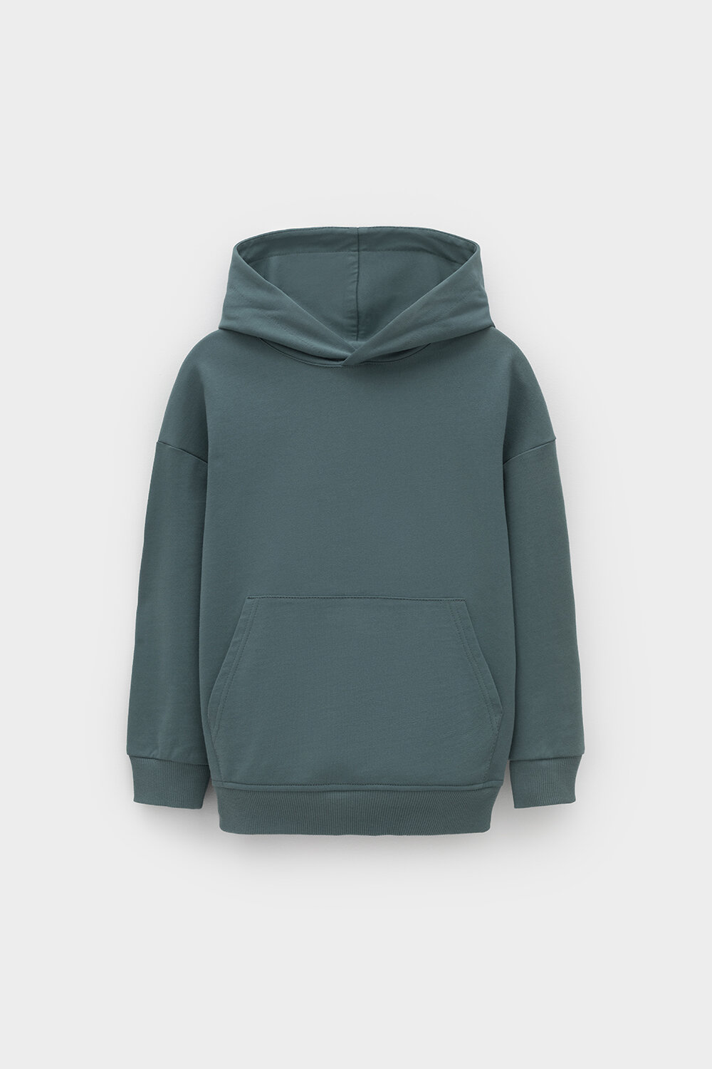 Трикотажное худи с капюшоном из однотонного петельчатого футера. Спереди удобный накладной карман-кенгуру. Манжеты и пояс из эластичного трикотажа в рубчик.
