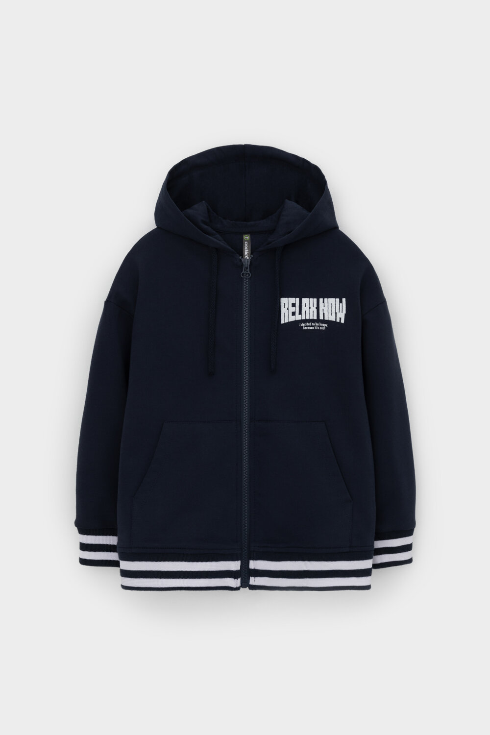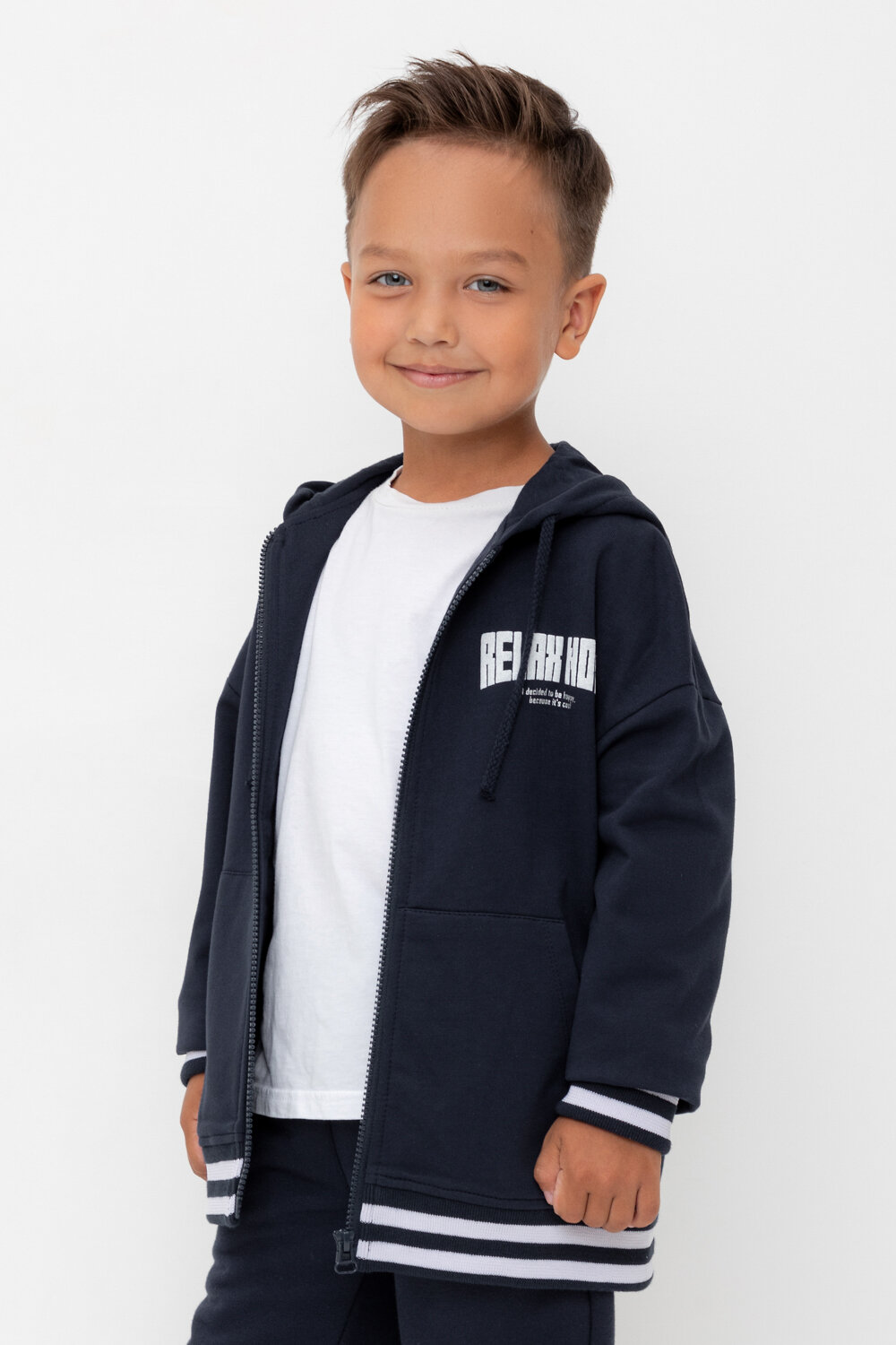 Толстовка с капюшоном для мальчика из мягкого трикотажа. В составе 80% натурального хлопка и 20% полиэстера, при этом полиэстер ввязан внутрь по особой технологии и не соприкасается с кожей. Воротник, манжеты и пояс - вязаные. Спереди два удобных накладных кармана.