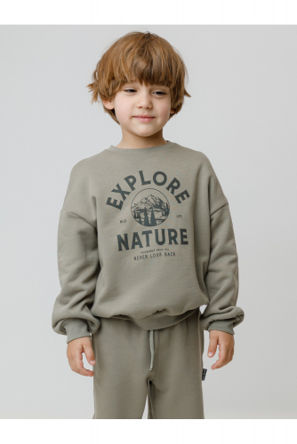 Свитшот для мальчика из высококачественного петельчатого футера. Обтачка горловины, манжеты и пояс выполнены из эластичного полотна. Для удобства одевания имеется застёжка на кнопки в размерах 92 и 98. Оригинальный принт нанесён с помощью стойких текстильных гипоаллергенных красителей.